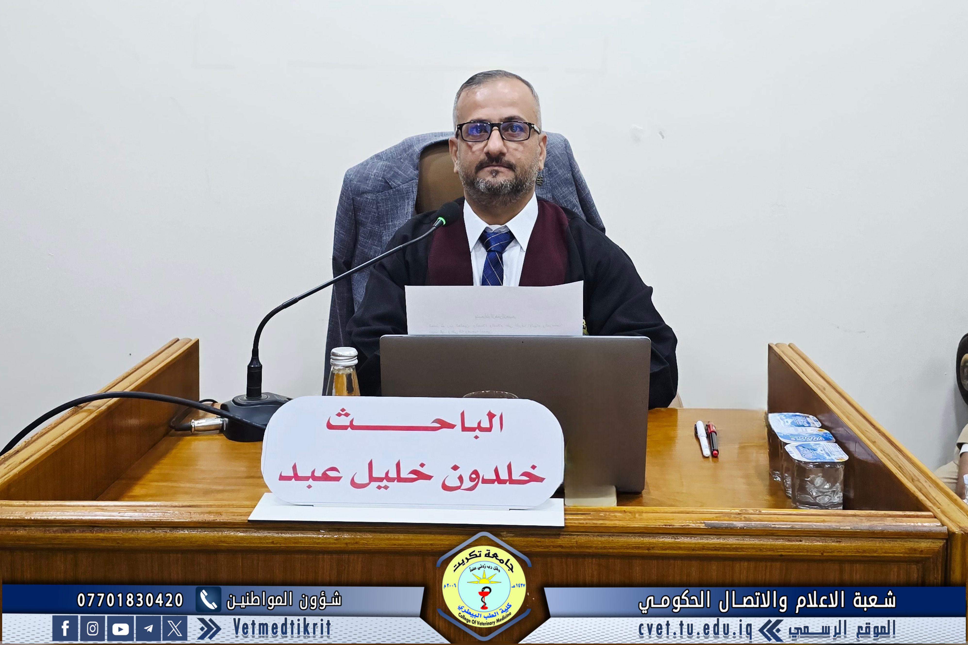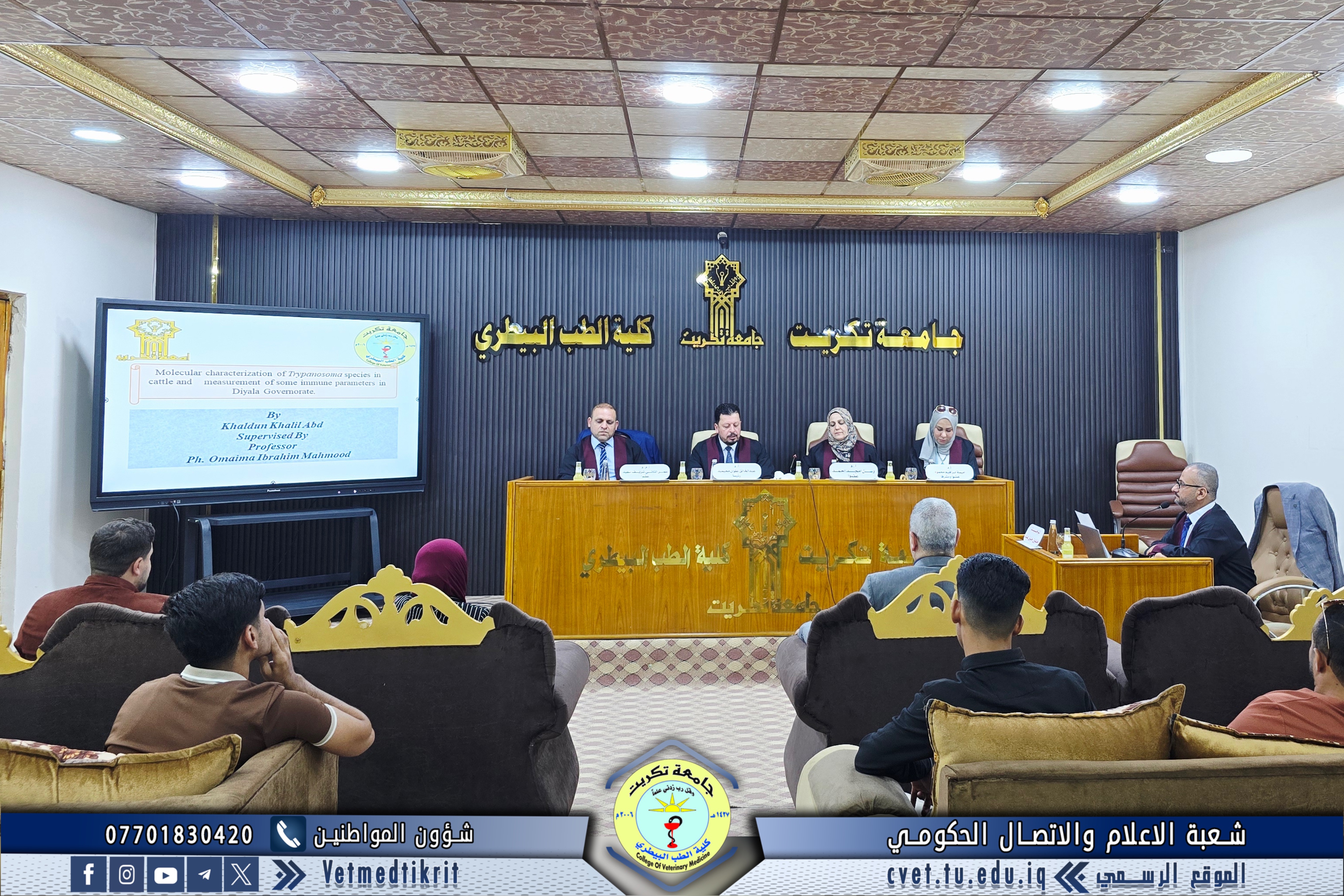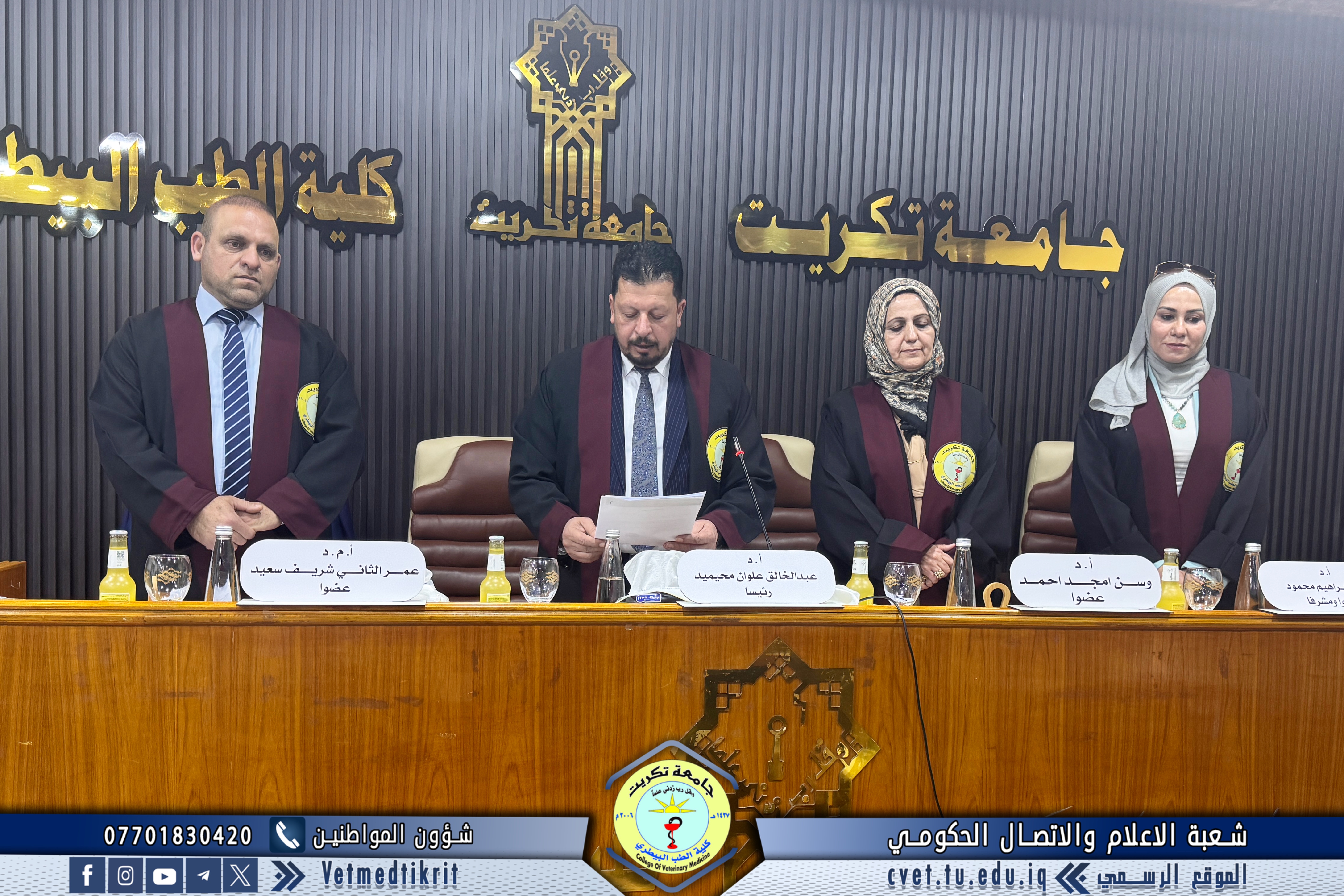 تم بعون الله تعالى في كلية الطب البيطري في جامعة تكريت وبحضور الاستاذ الدكتور بشار صادق نومي عميد الكلية مناقشة رسالة الماجستير الموسومة (التوصيف الجزيئي لانواع طفيلي التريبانوسوما في الابقار وقياس بعض المعايير المناعية في محافظة ديالى) للطالب (خلدون خليل عبد صالح) في تخصص (الاحياء المجهرية). حيث تألفت لجنة المناقشة من كل من: