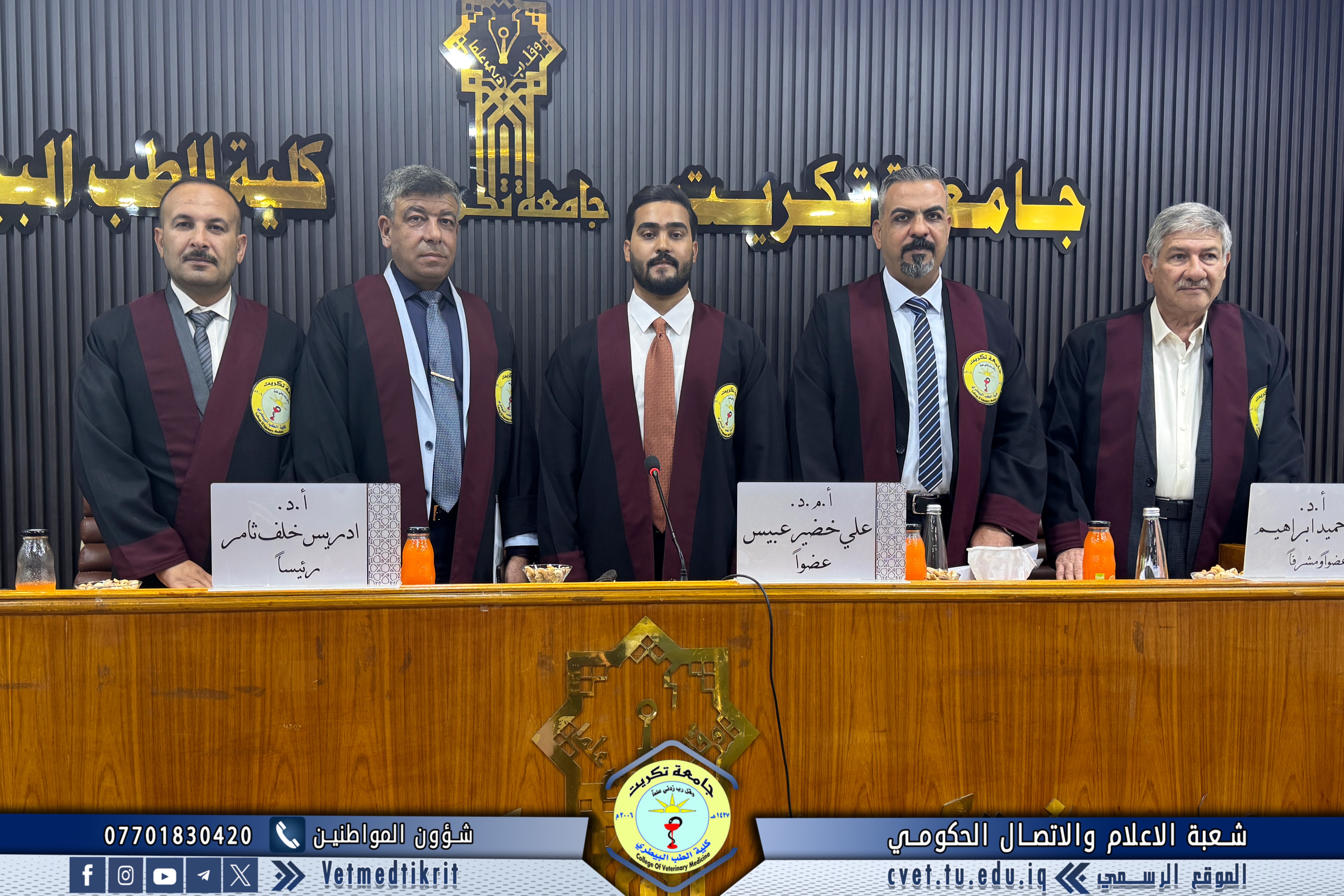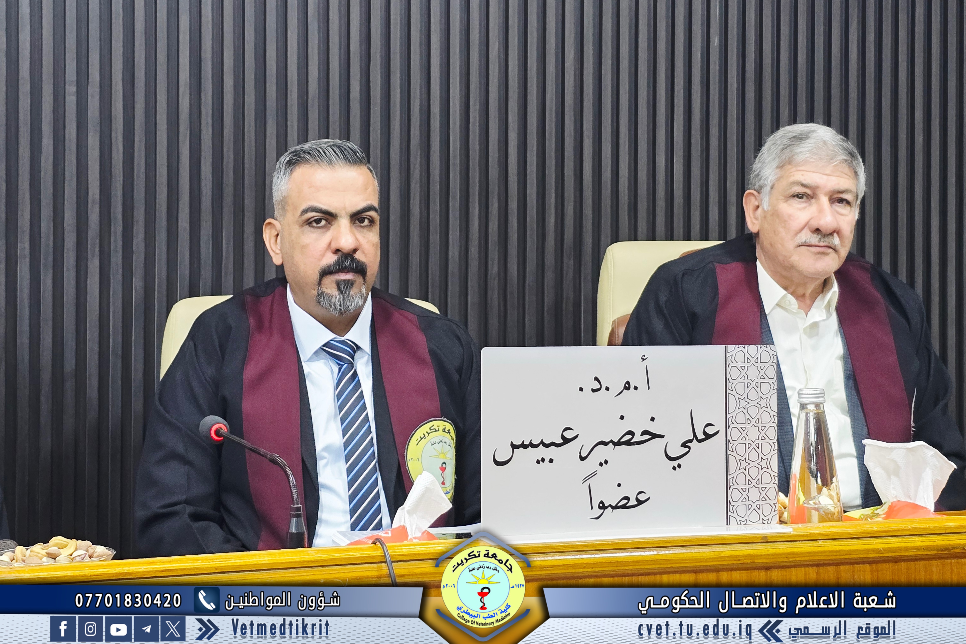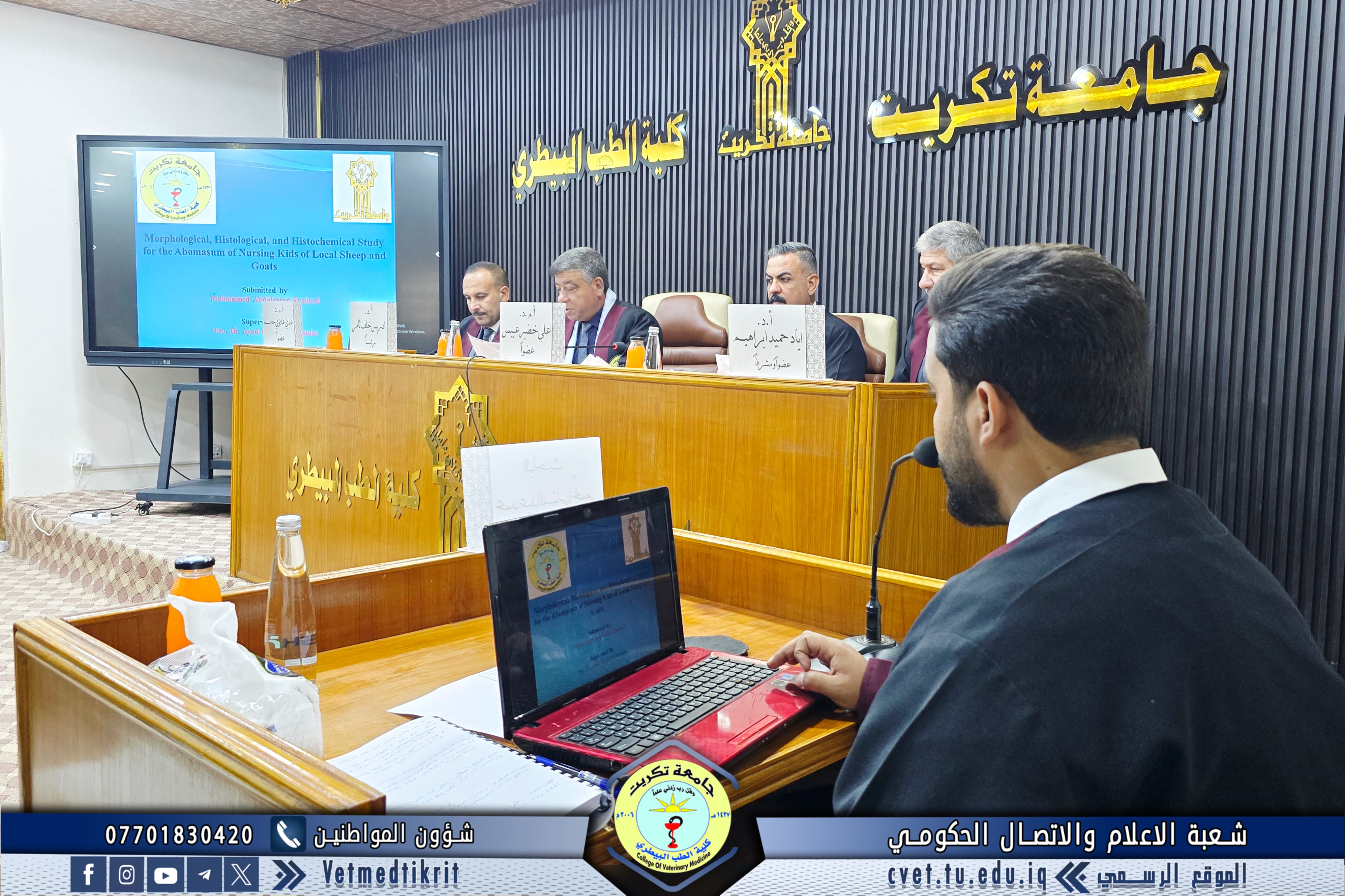 تم بعون الله تعالى في كلية الطب البيطري في جامعة تكريت وبحضور الاستاذ الدكتور بشار صادق نومي عميد الكلية مناقشة رسالة الماجستير الموسومة (دراسة مقارنة مظهرية, نسجية ونسجية كيميائية للمنفحة في الحملان الرضع في الاغنام والماعز المحلية) للطالب (محمد عبدالستار رشيد محمد) في تخصص (الانسجة البيطرية). حيث تألفت لجنة المناقشة من كل من: