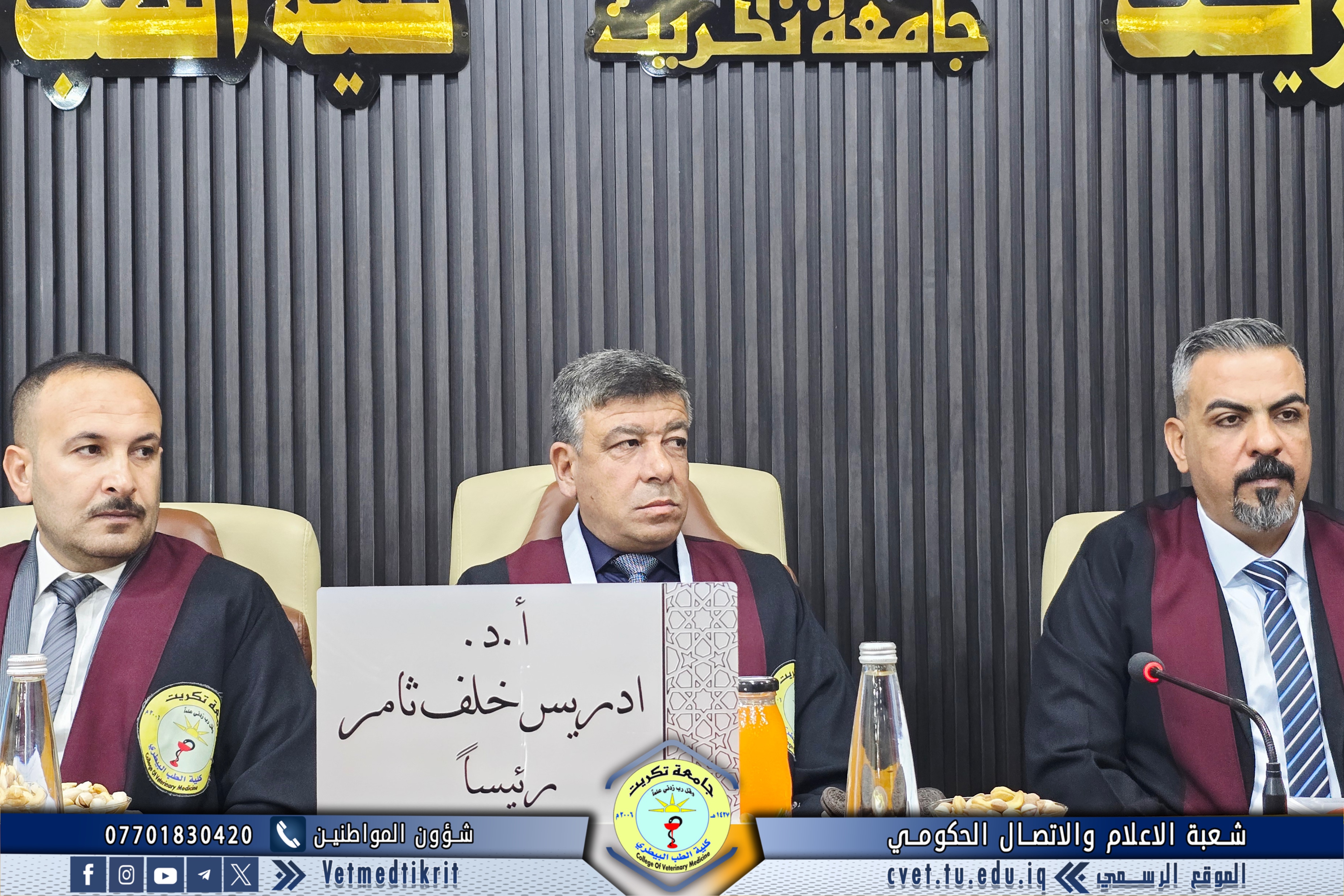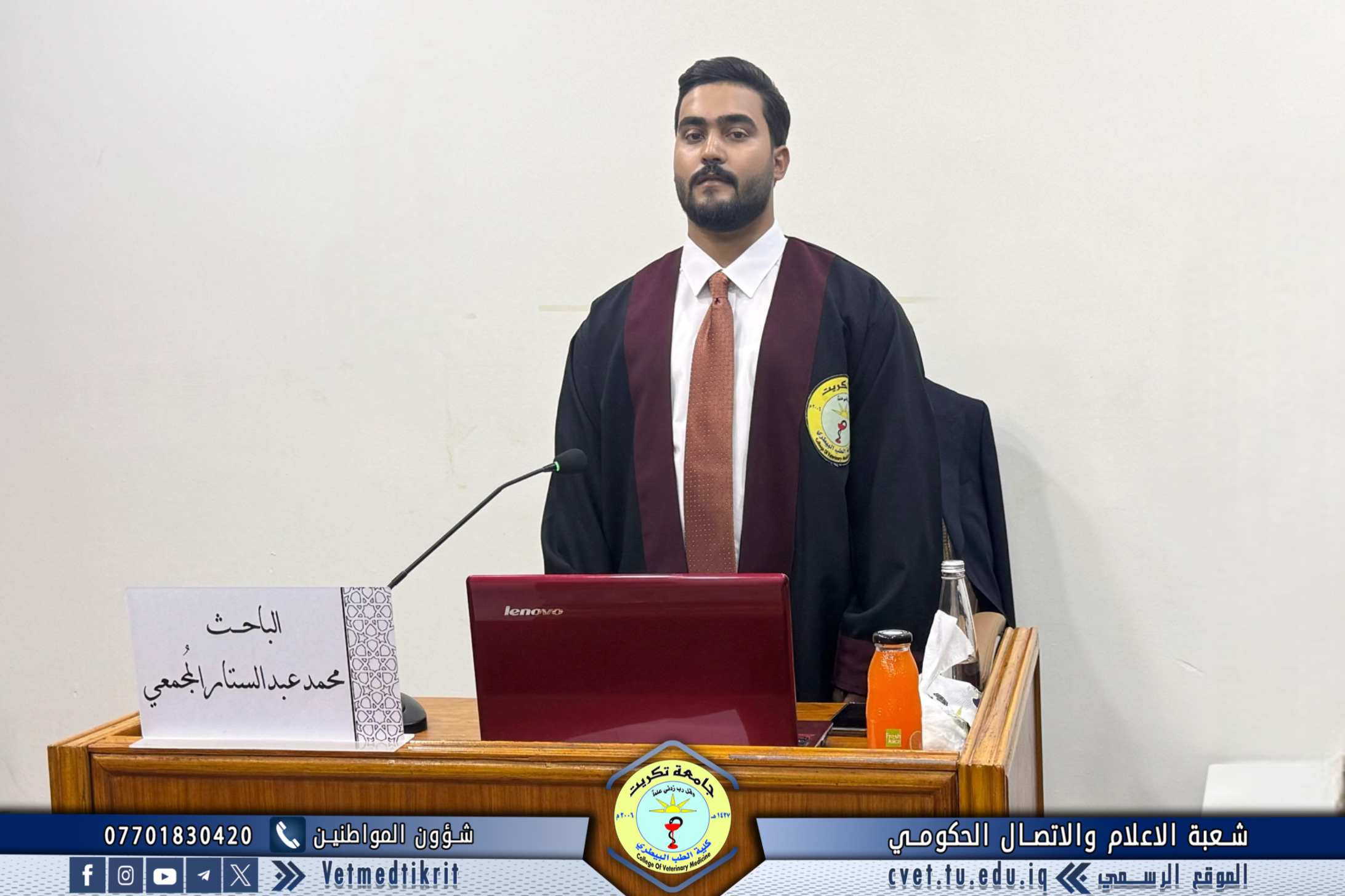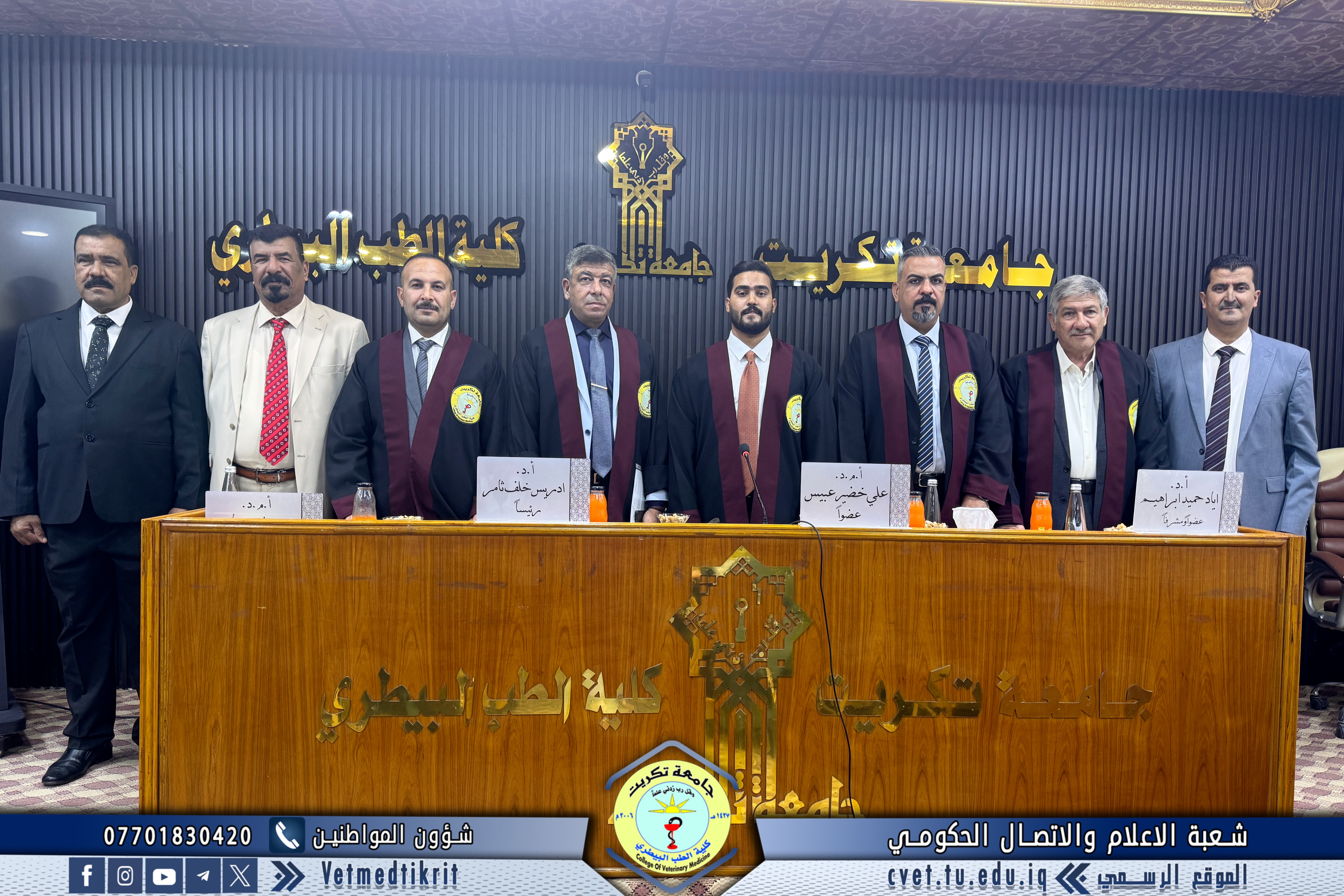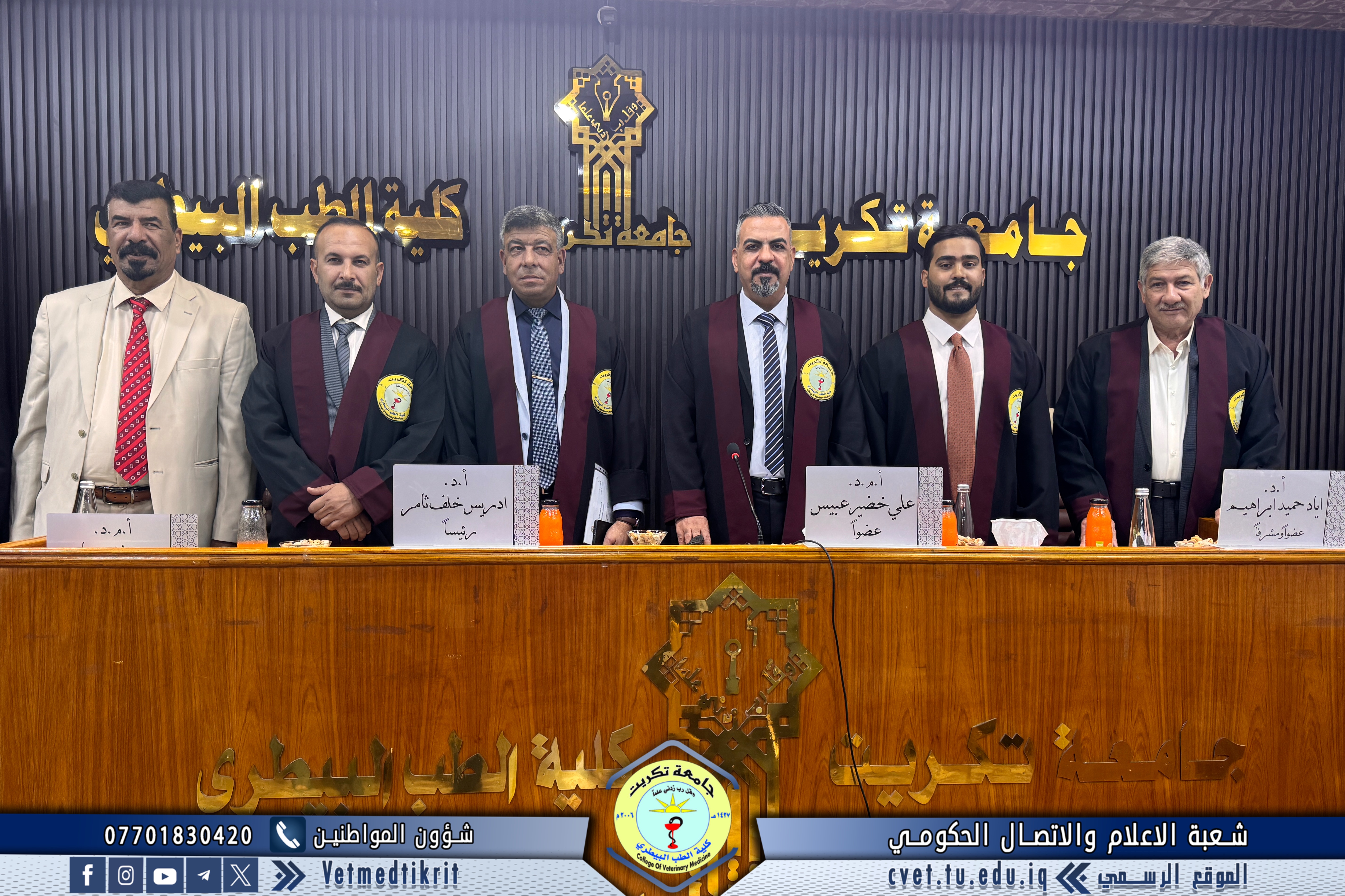 تم بعون الله تعالى في كلية الطب البيطري في جامعة تكريت وبحضور الاستاذ الدكتور بشار صادق نومي عميد الكلية مناقشة رسالة الماجستير الموسومة (دراسة مقارنة مظهرية, نسجية ونسجية كيميائية للمنفحة في الحملان الرضع في الاغنام والماعز المحلية) للطالب (محمد عبدالستار رشيد محمد) في تخصص (الانسجة البيطرية). حيث تألفت لجنة المناقشة من كل من: