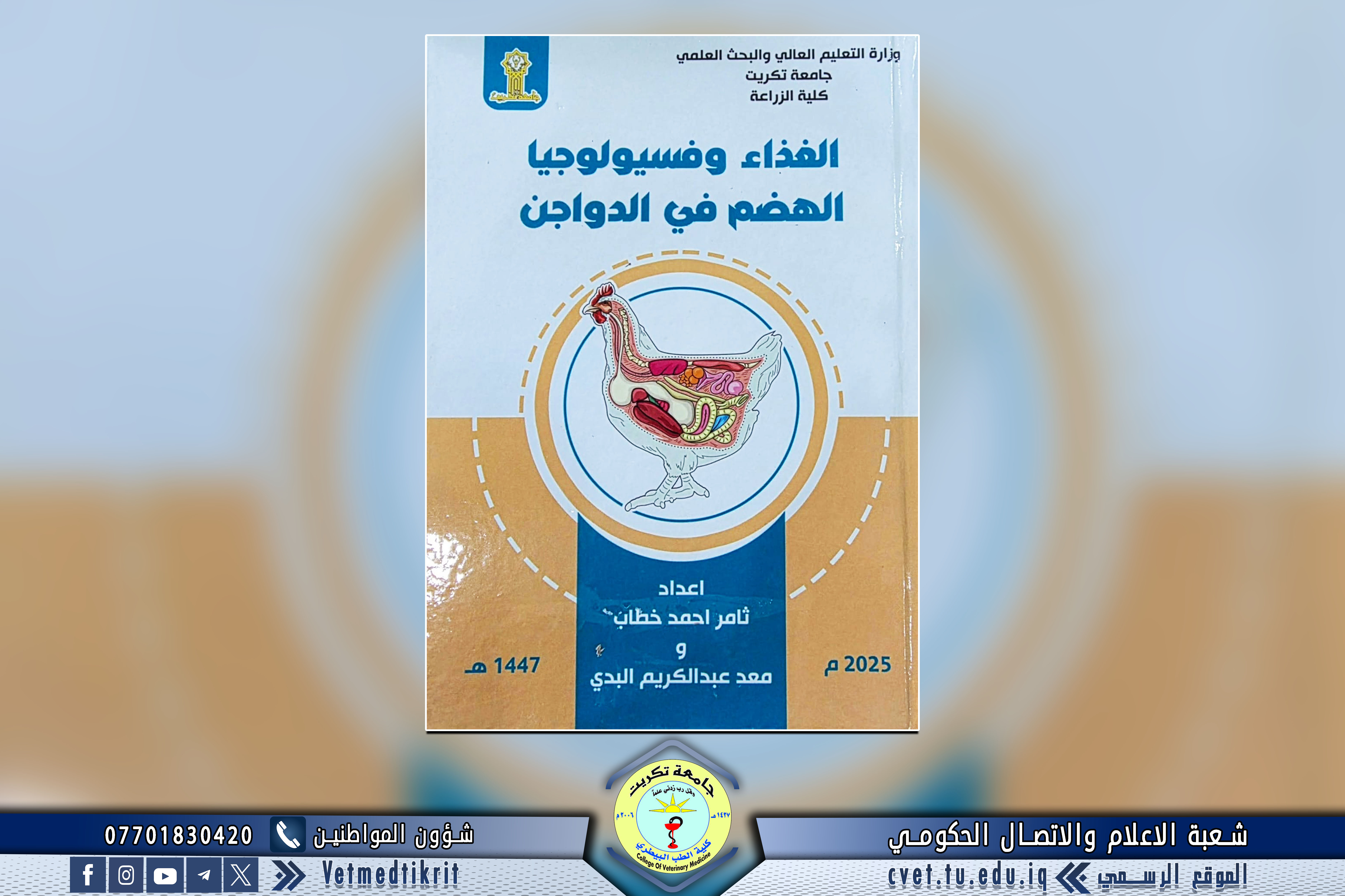 في إنجاز علمي جديد يُضاف إلى سجل كلية الطب البيطري بجامعة تكريت، ألّف المدرس الدكتور ثامر أحمد خطاب، التدريسي في الكلية، كتابًا علميًا تخصصيًا بعنوان (الغذاء وفسيولوجيا الهضم في الدواجن)، وذلك بالتعاون مع الدكتور معد عبدالكريم محمود من كلية الزراعة.