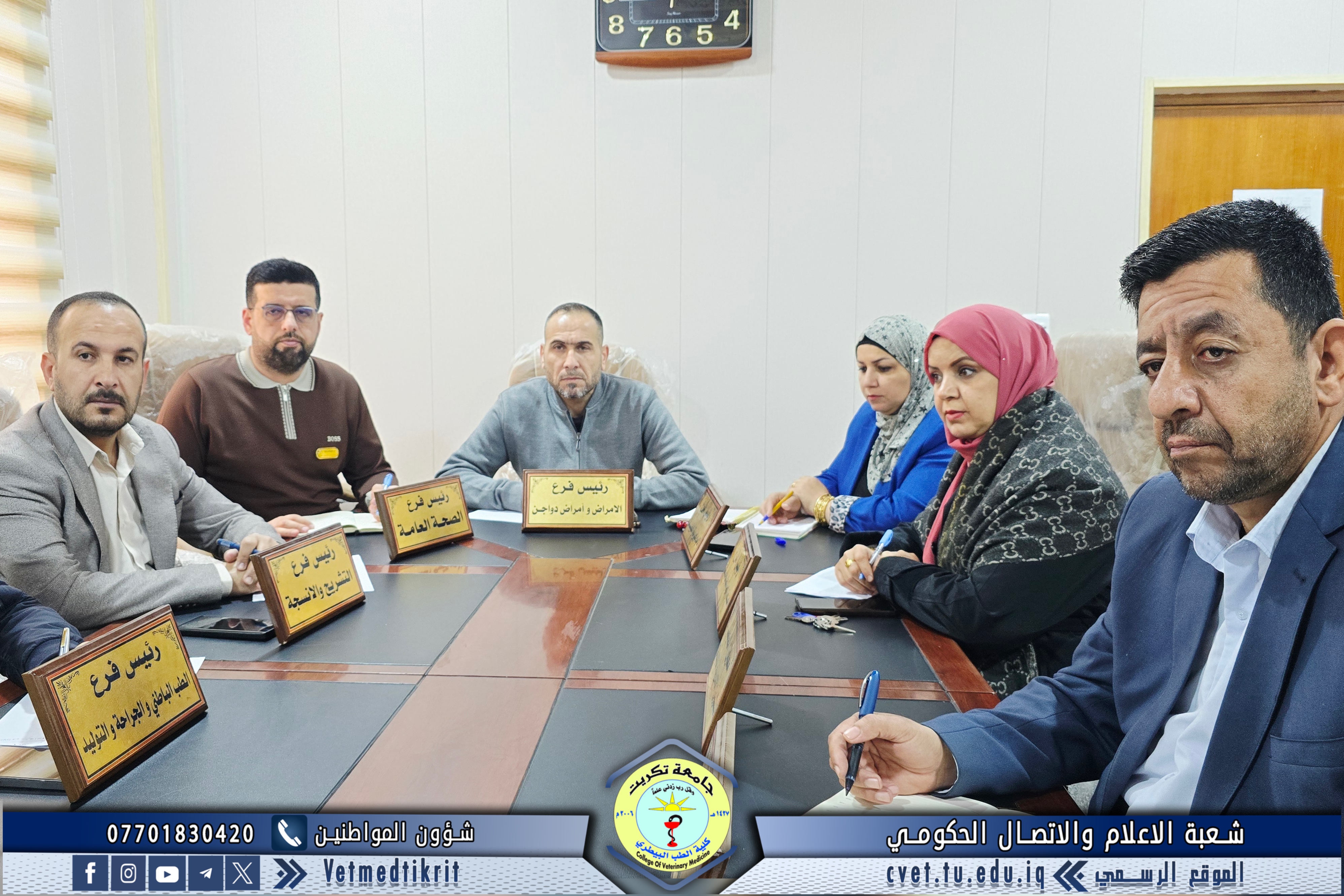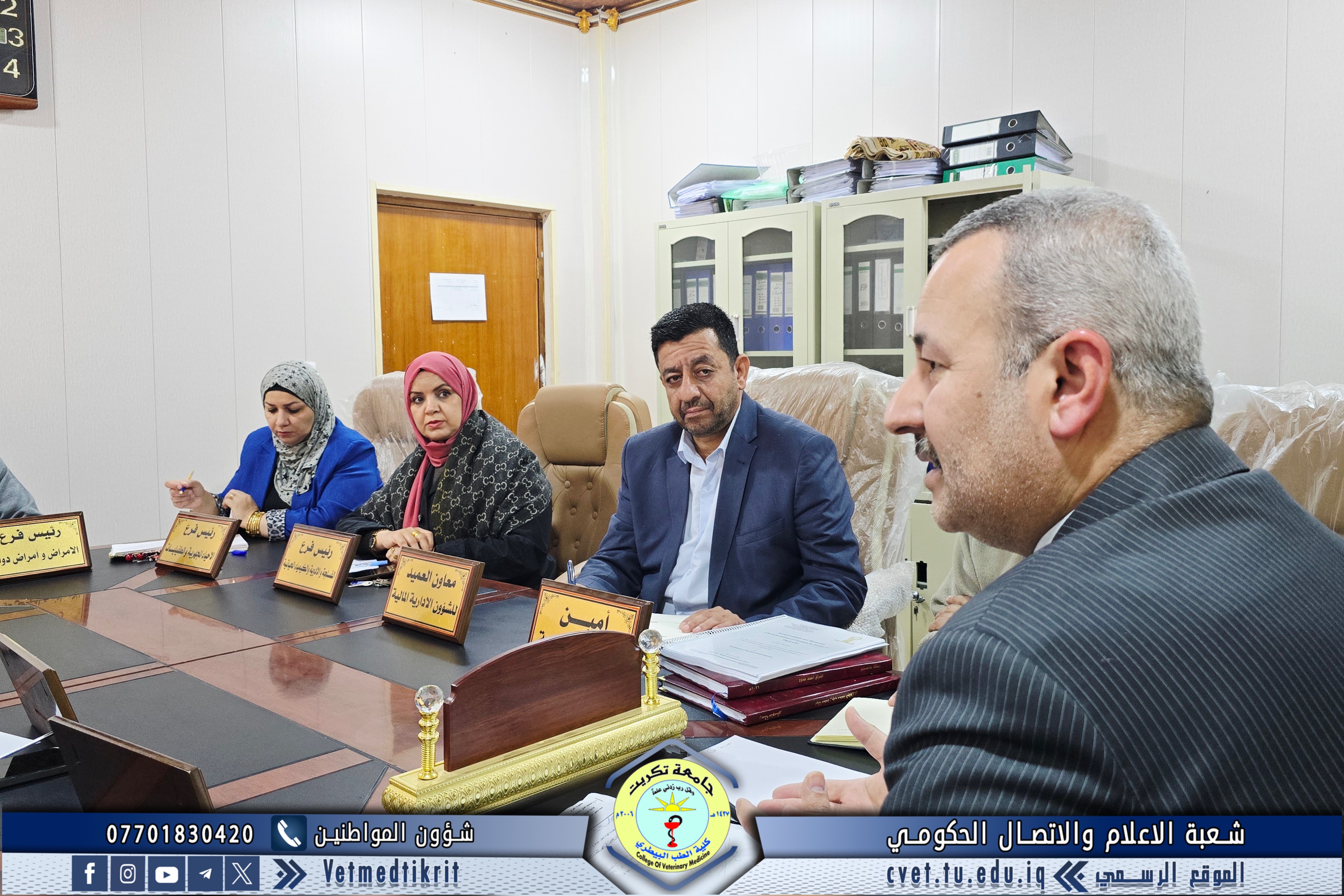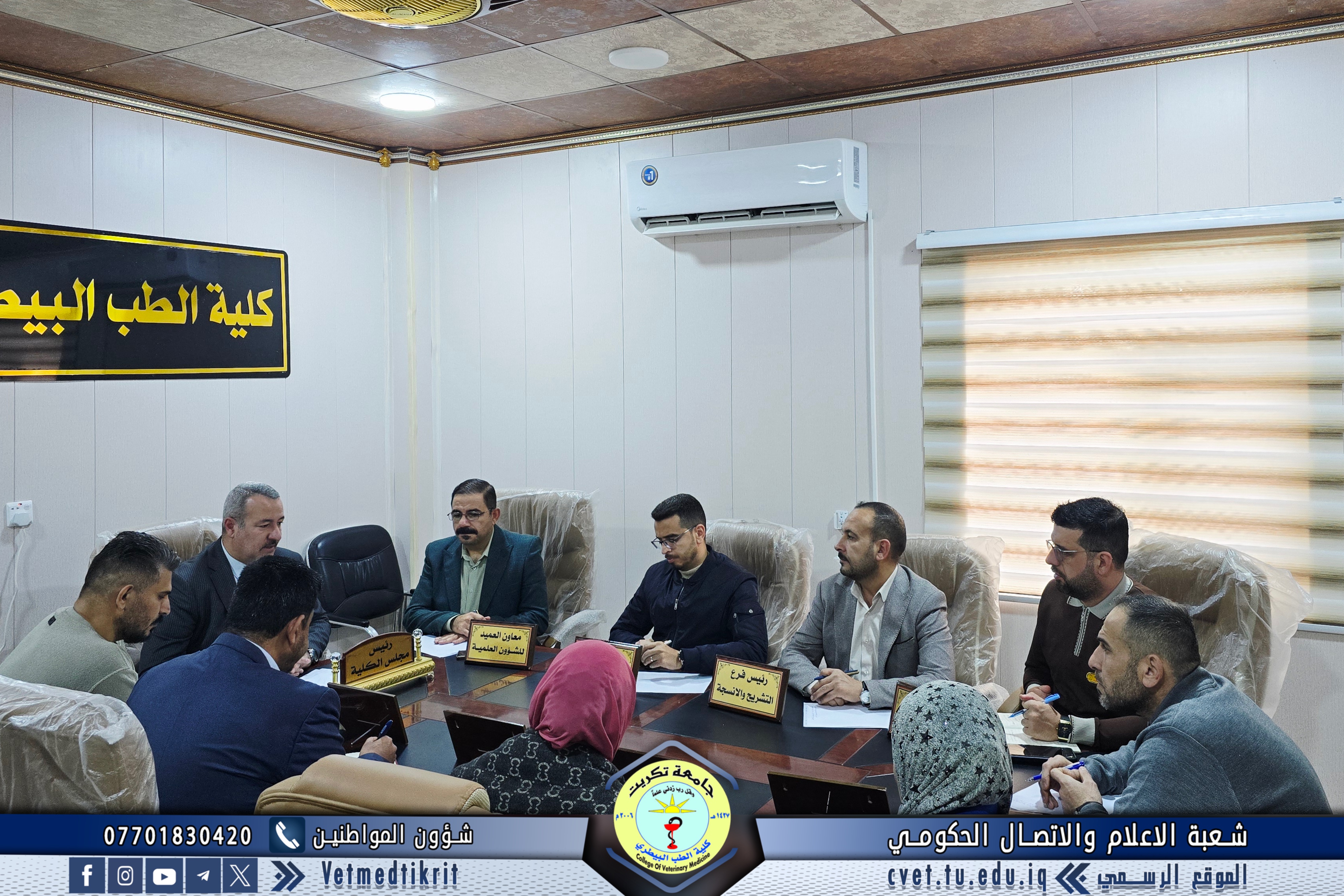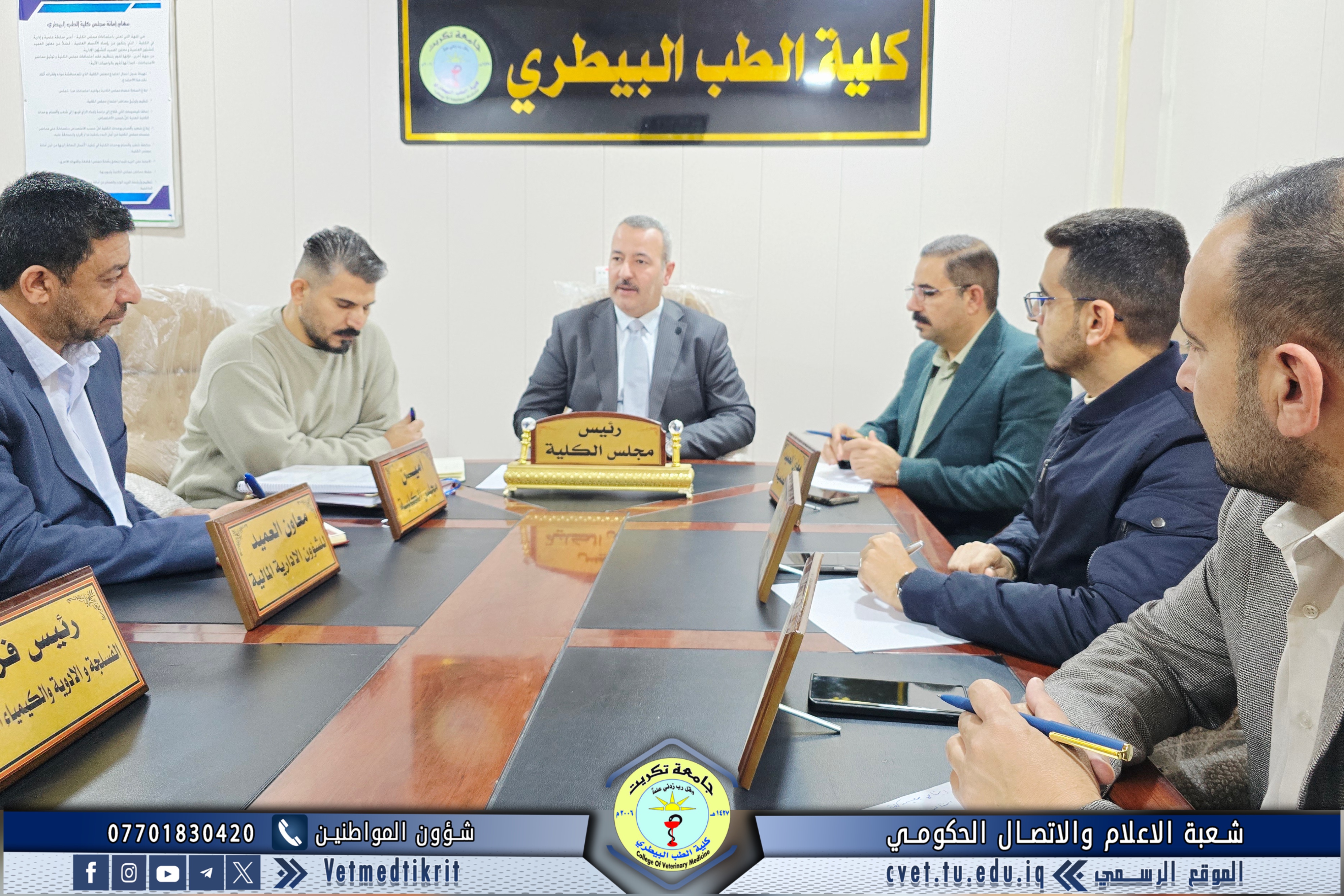ترأس الأستاذ الدكتور بشار صادق نومي، عميد كلية الطب البيطري في جامعة تكريت، جلسة مجلس الكلية المنعقدة يوم الثلاثاء الموافق 25-03-2026، بحضور السادة معاوني العميد للشؤون العلمية والإدارية، والسيدات والسادة رؤساء الفروع العلمية، إضافة إلى أمين مجلس الكلية.