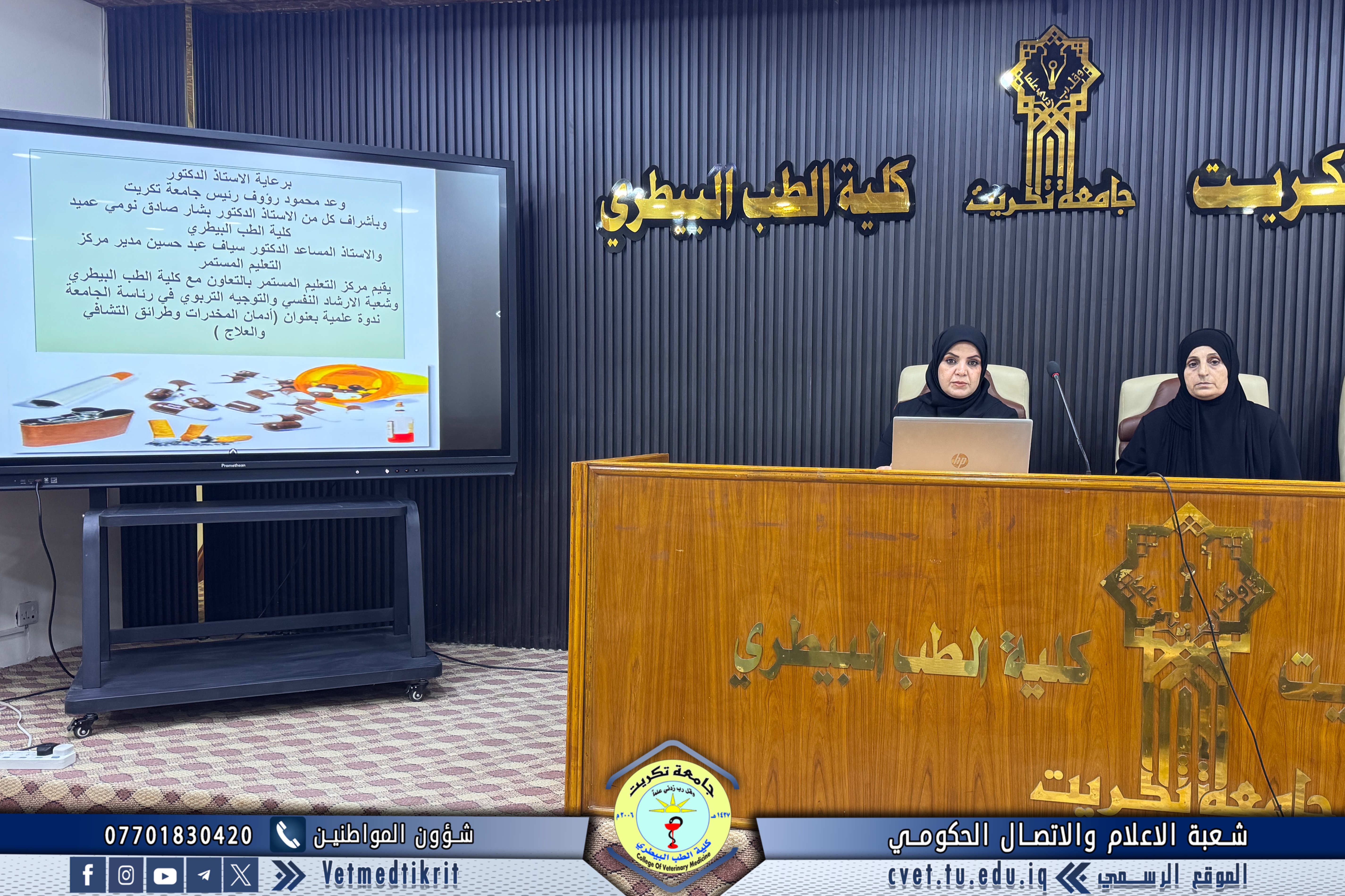 برعاية عمادة كلية الطب البيطري بجامعة تكريت، وبالتعاون مع مركز التعليم المستمر، أقامت الكلية ندوة تثقيفية بعنوان (إدمان المخدرات وطرق التشافي منها)، حاضر فيها كلٌّ من الأستاذ الدكتورة سهام عجمي وادي والأستاذ الدكتورة وسن سرحان عبيد.