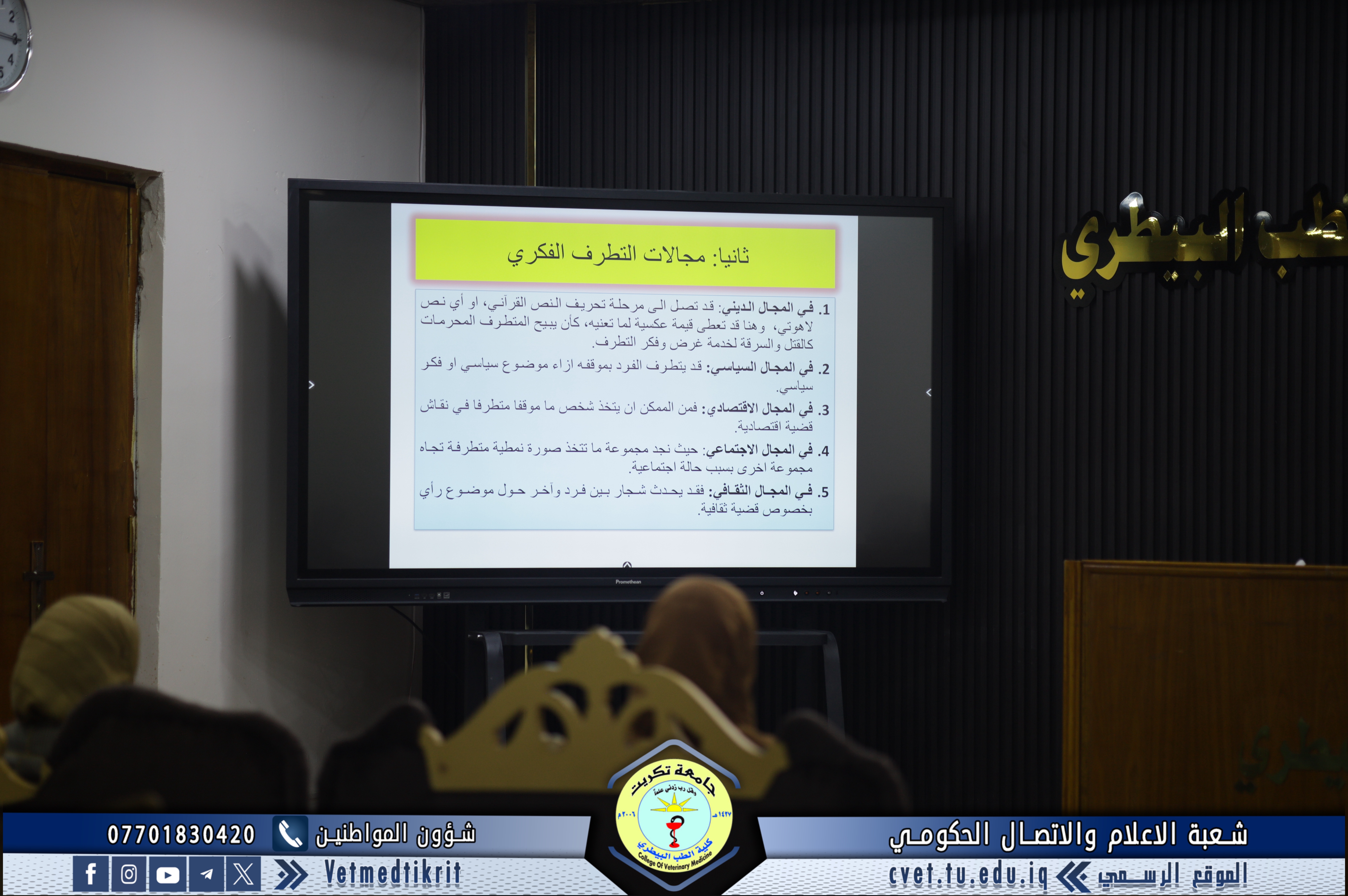 برعاية عمادة كلية الطب البيطري بجامعة تكريت، نظّمت وحدة الإرشاد النفسي والتوجيه التربوي بالتعاون مع قسم الإعلام في كلية الآداب ومركز التعليم المستمر، ندوة تثقيفية بعنوان (الإعلام ومواجهة التطرف الفكري)، حاضر فيها كلٌّ من الأستاذ الدكتور يوسف حسن محمود، والمدرس ياسمين خالد خضير، والمدرس منى سفيان لبيب من قسم الإعلام في كلية الآداب.
