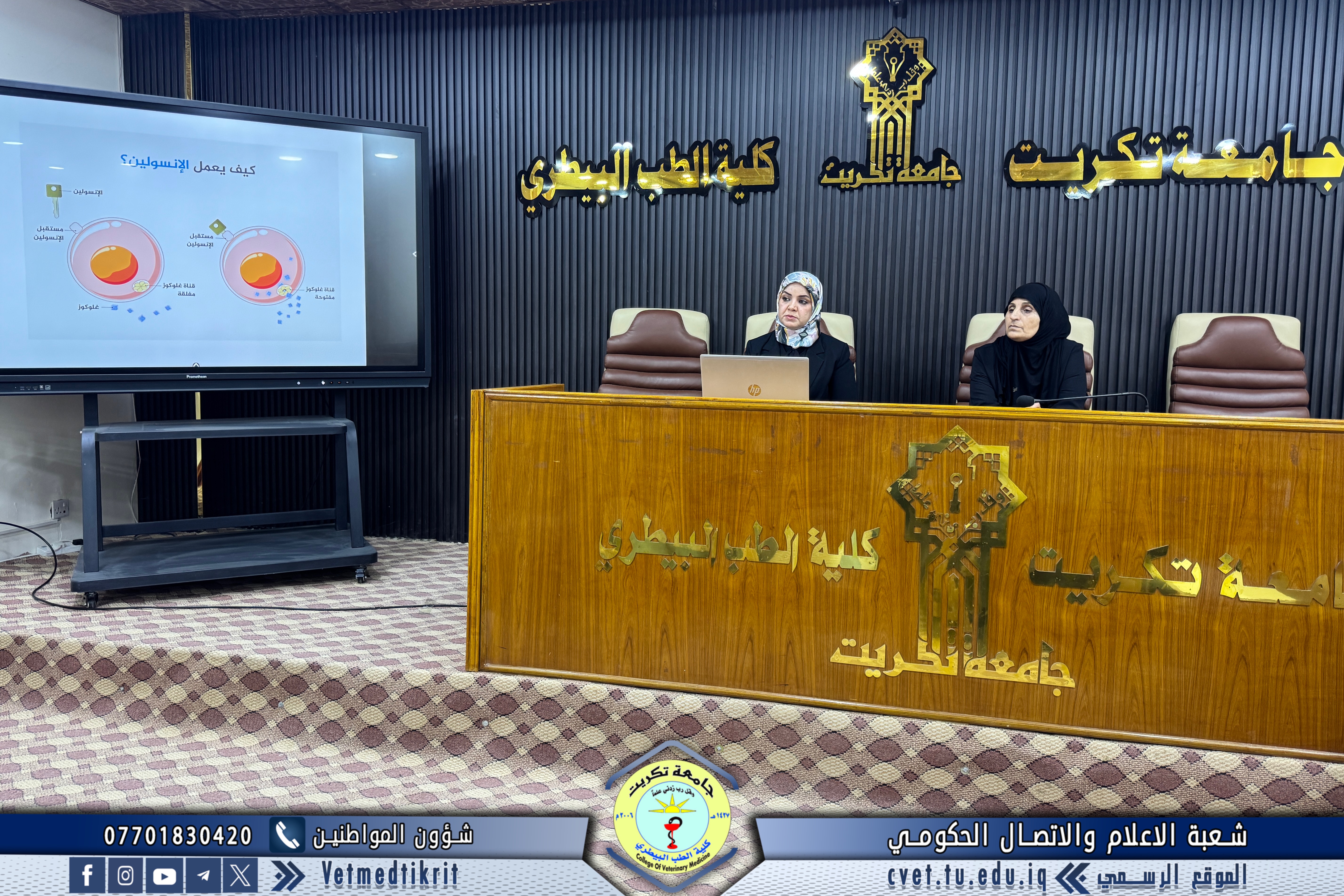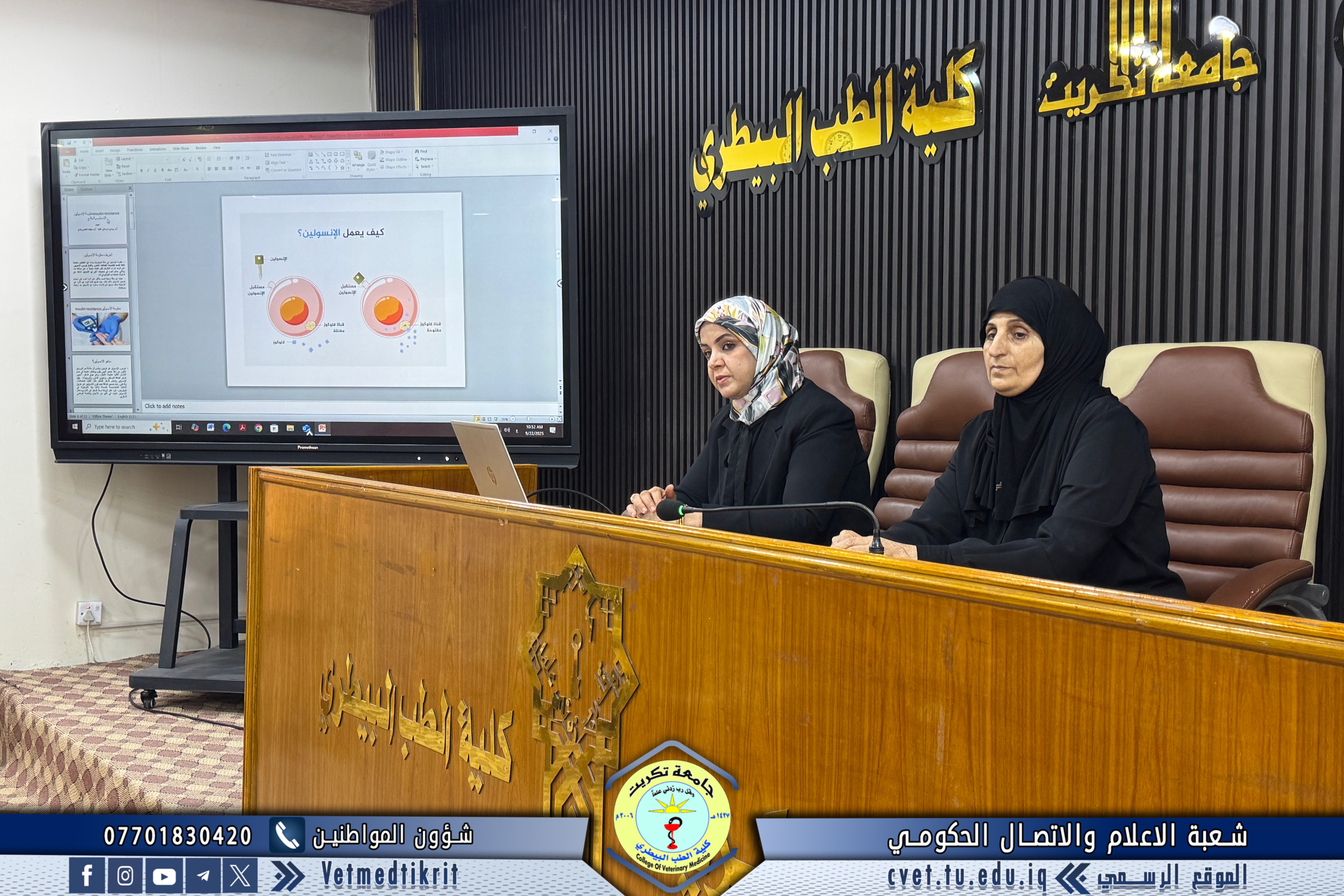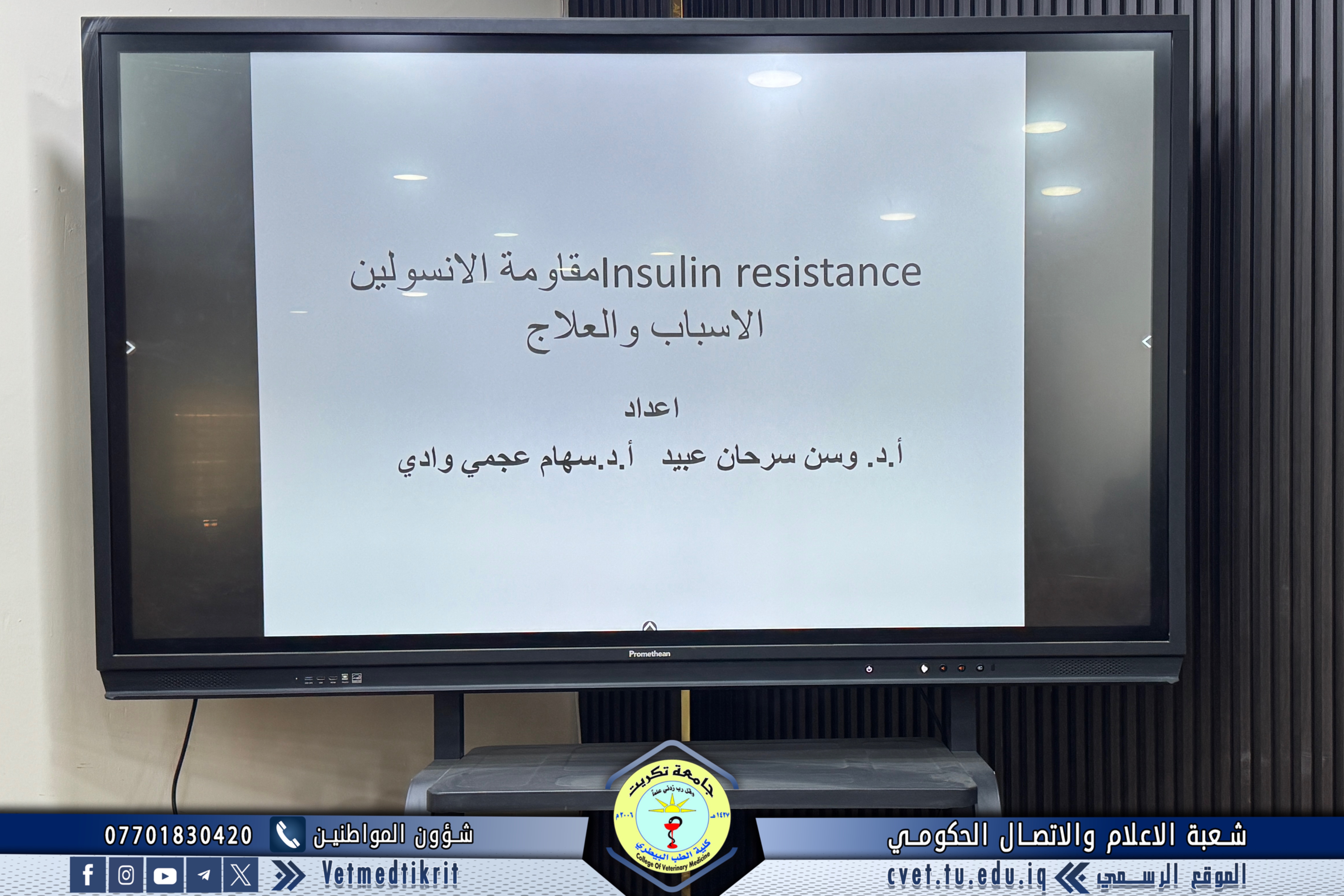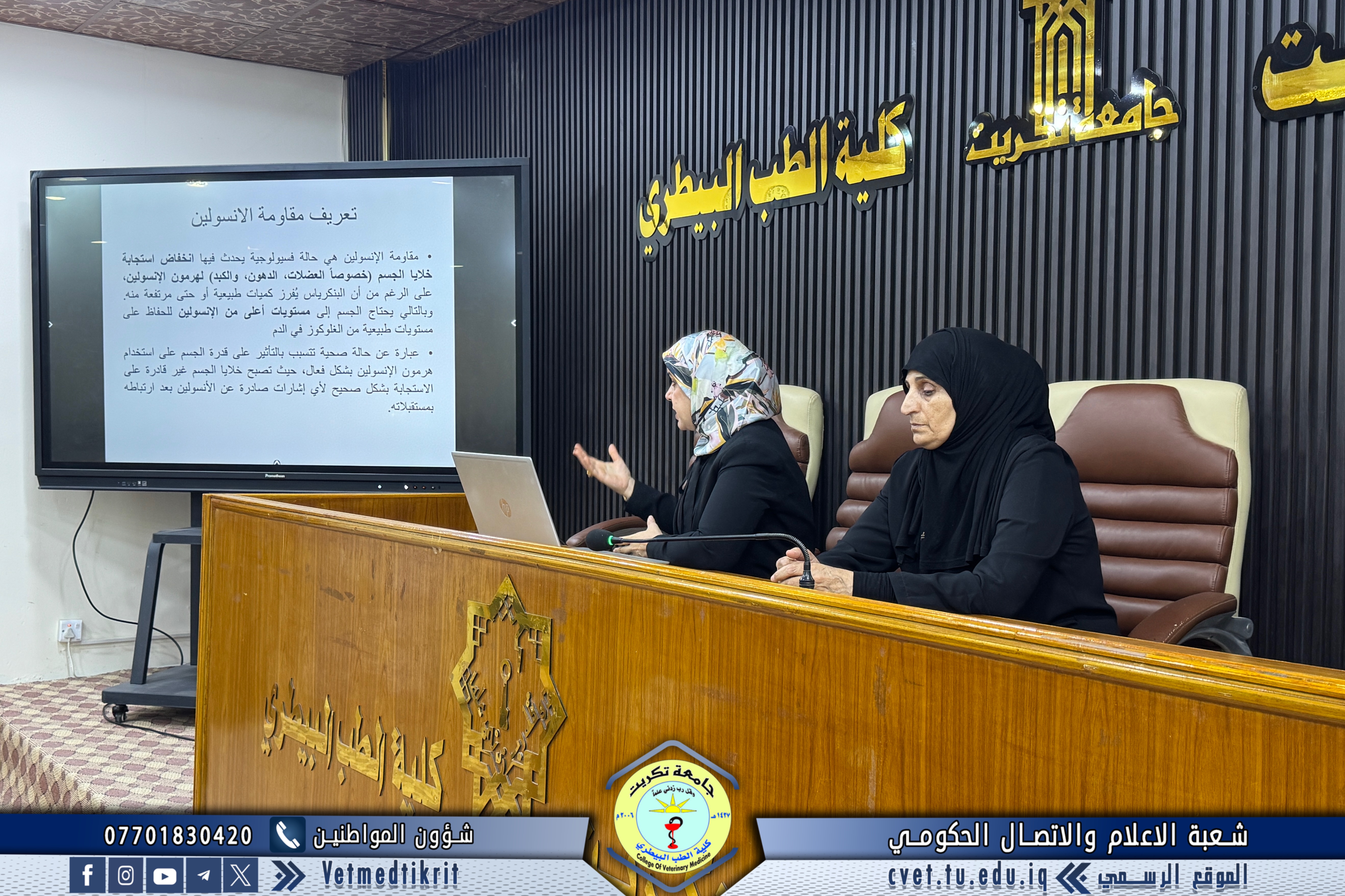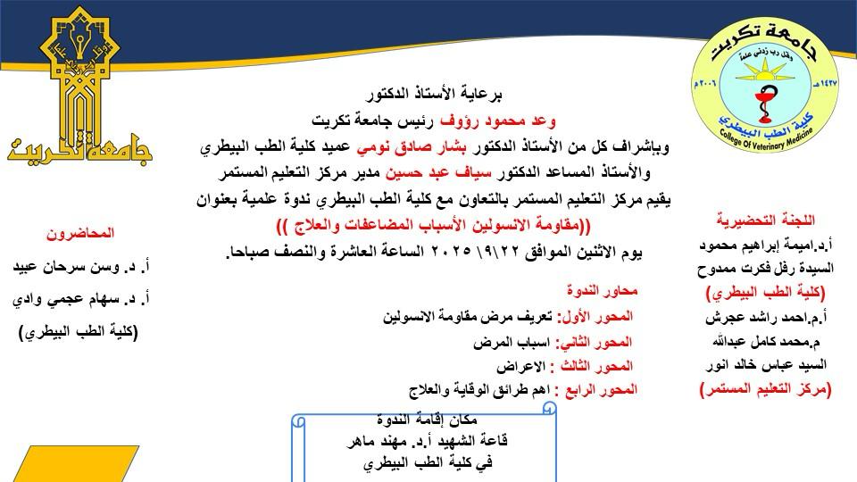 أقامت كلية الطب البيطري في جامعة تكريت ندوة علمية بعنوان (مقاومة الإنسولين: الأسباب، المضاعفات والعلاج)، حاضر فيها كل من الأستاذ الدكتورة سهام عجمي وادي و الأستاذ الدكتورة وسن سرحان عبيد. وتناولت الندوة عدة محاور علمية مهمة، شملت: تعريف مقاومة الإنسولين وأهميته في الصحة العامة، أسباب المرض والعوامل المؤدية إليه، أبرز الأعراض والمضاعفات المصاحبة، أهم طرق الوقاية ووسائل العلاج الحديثة. أقيمت الندوة في قاعة الدكتور مهند ماهر بالكلية، وحضرها عدد من أعضاء الكادر التدريسي والوظيفي، حيث جاءت ضمن نشاطات الكلية العلمية الرامية إلى رفع مستوى الوعي الصحي والطبي وتعزيز ثقافة الوقاية بين المنتسبين.