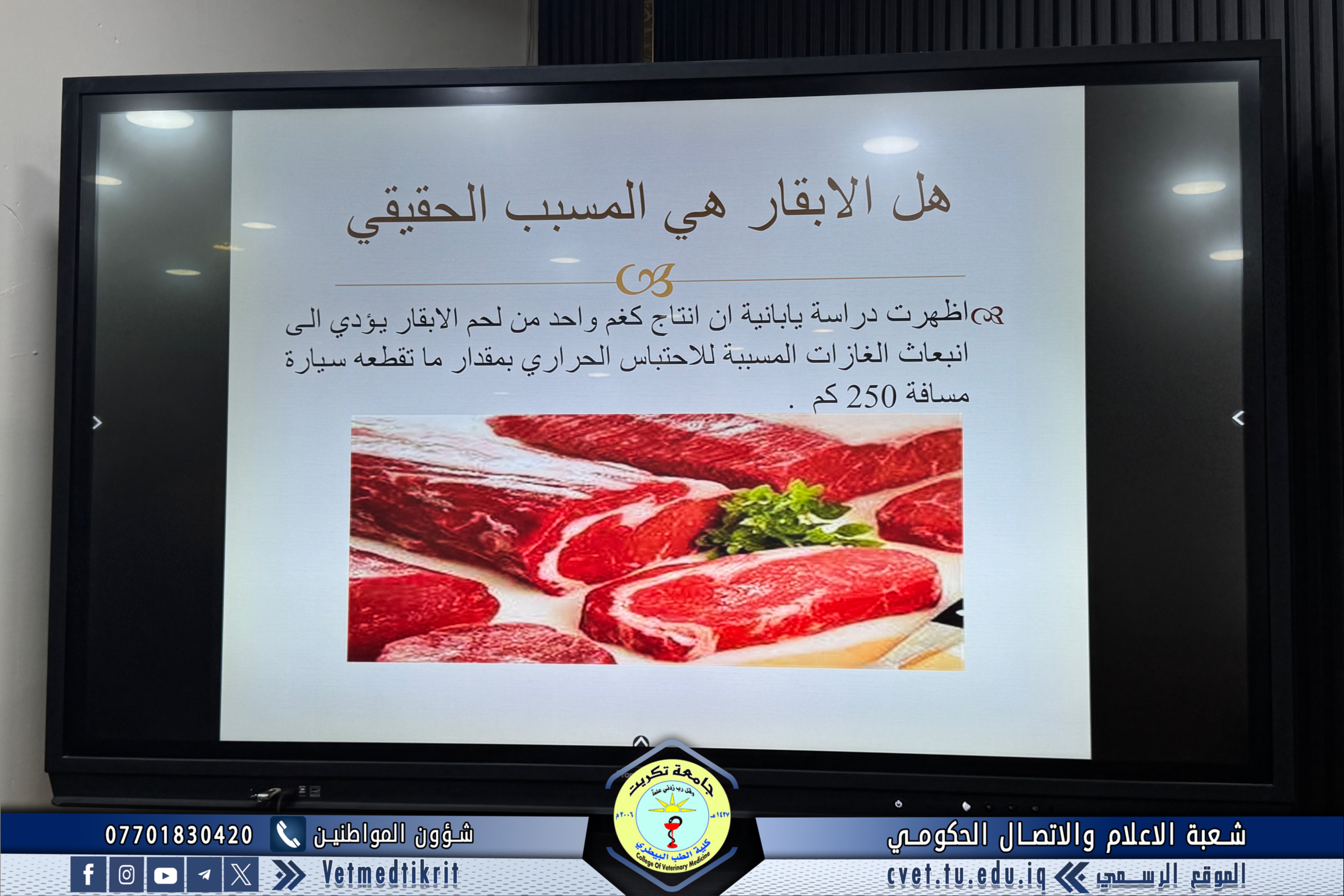أقامت كلية الطب البيطري في جامعة تكريت، بالتعاون مع مركز التعليم المستمر، ندوة علمية بعنوان "الأبقار والتغير المناخي"، حاضر فيها كل من الأستاذ الدكتور زياد طارق عمر و المدرس المساعد عامر إبراهيم علي.