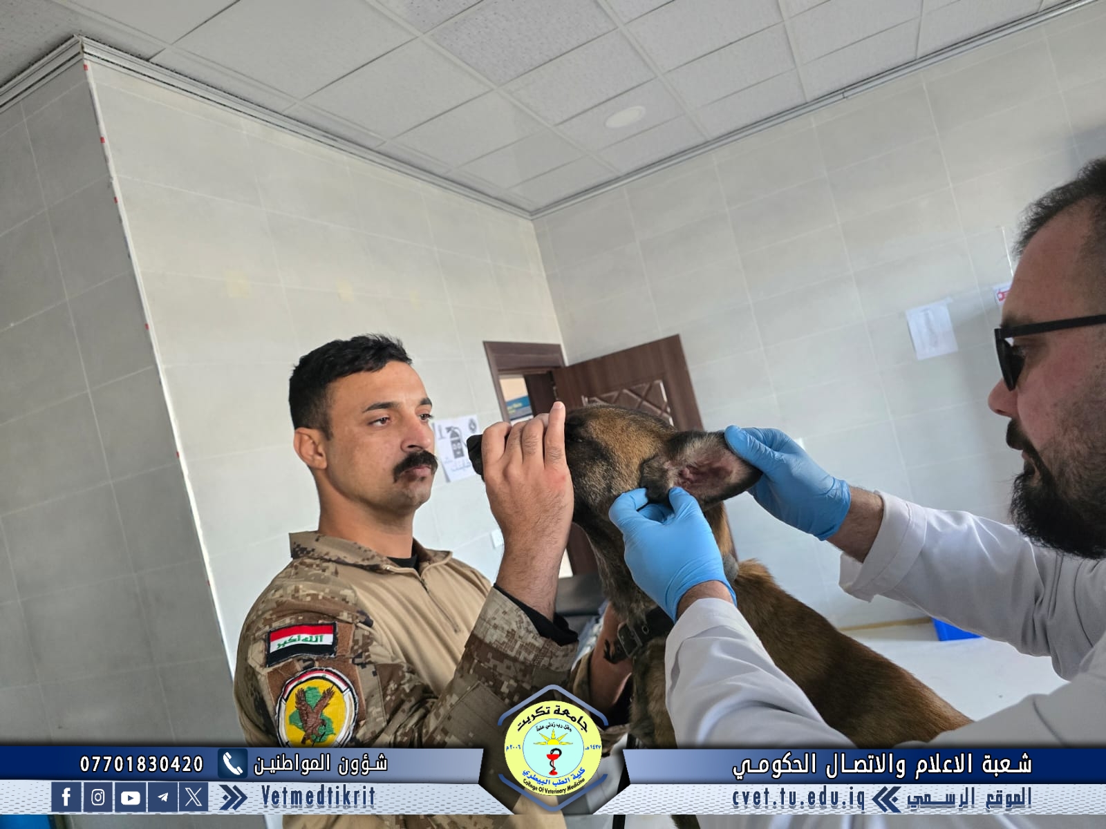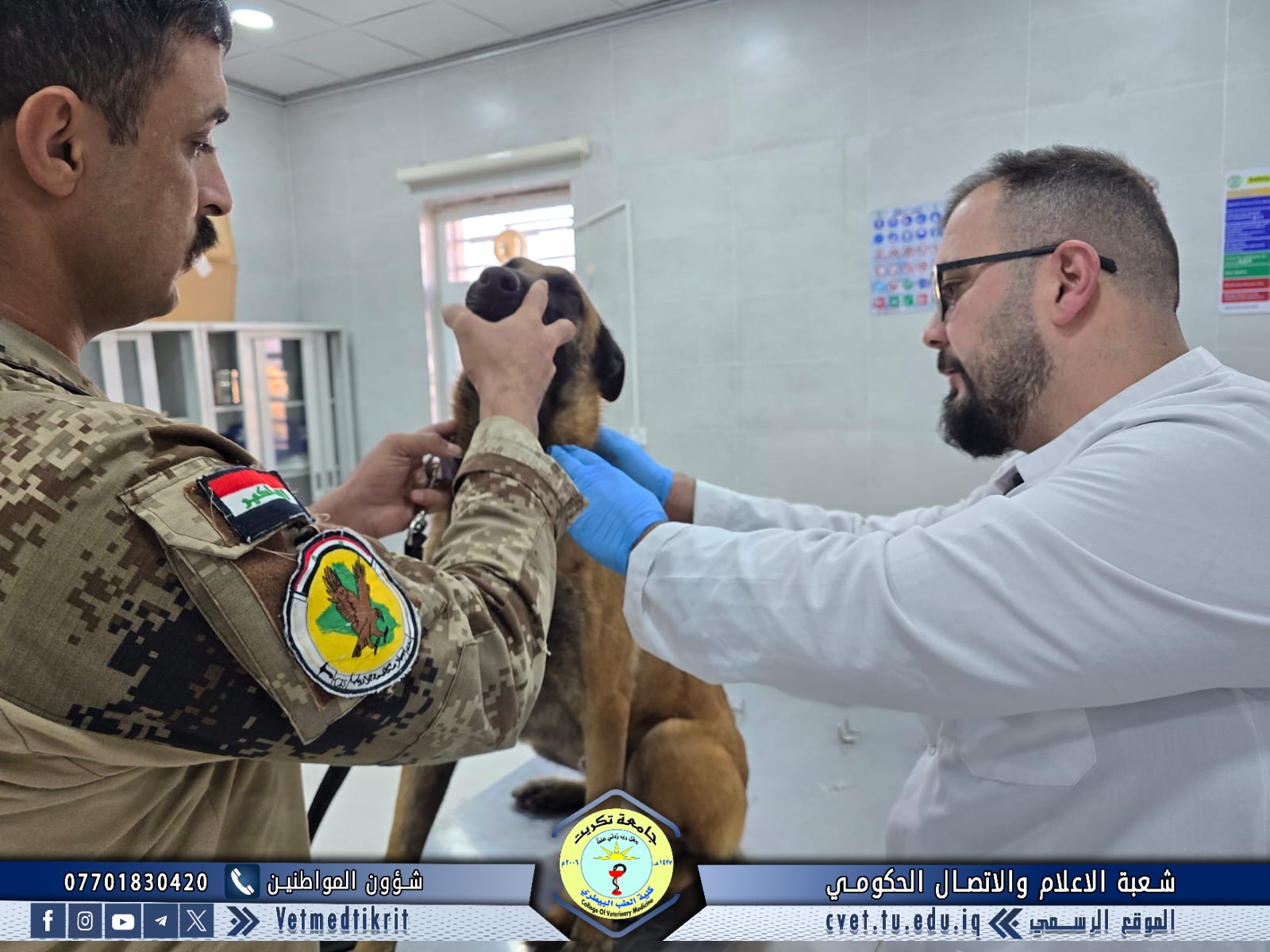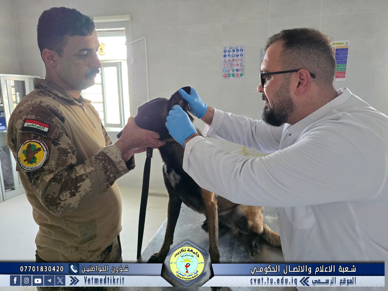 استقبلت وحدة العيادة الخارجية في كلية الطب البيطري بجامعة تكريت حالة بيطرية لكلب (K-9) تابع لجهاز مكافحة الإرهاب في محافظة صلاح الدين، وذلك لغرض إجراء الفحوصات الطبية الدورية اللازمة، وتشخيص وعلاج أي حالات مرضية محتملة.
