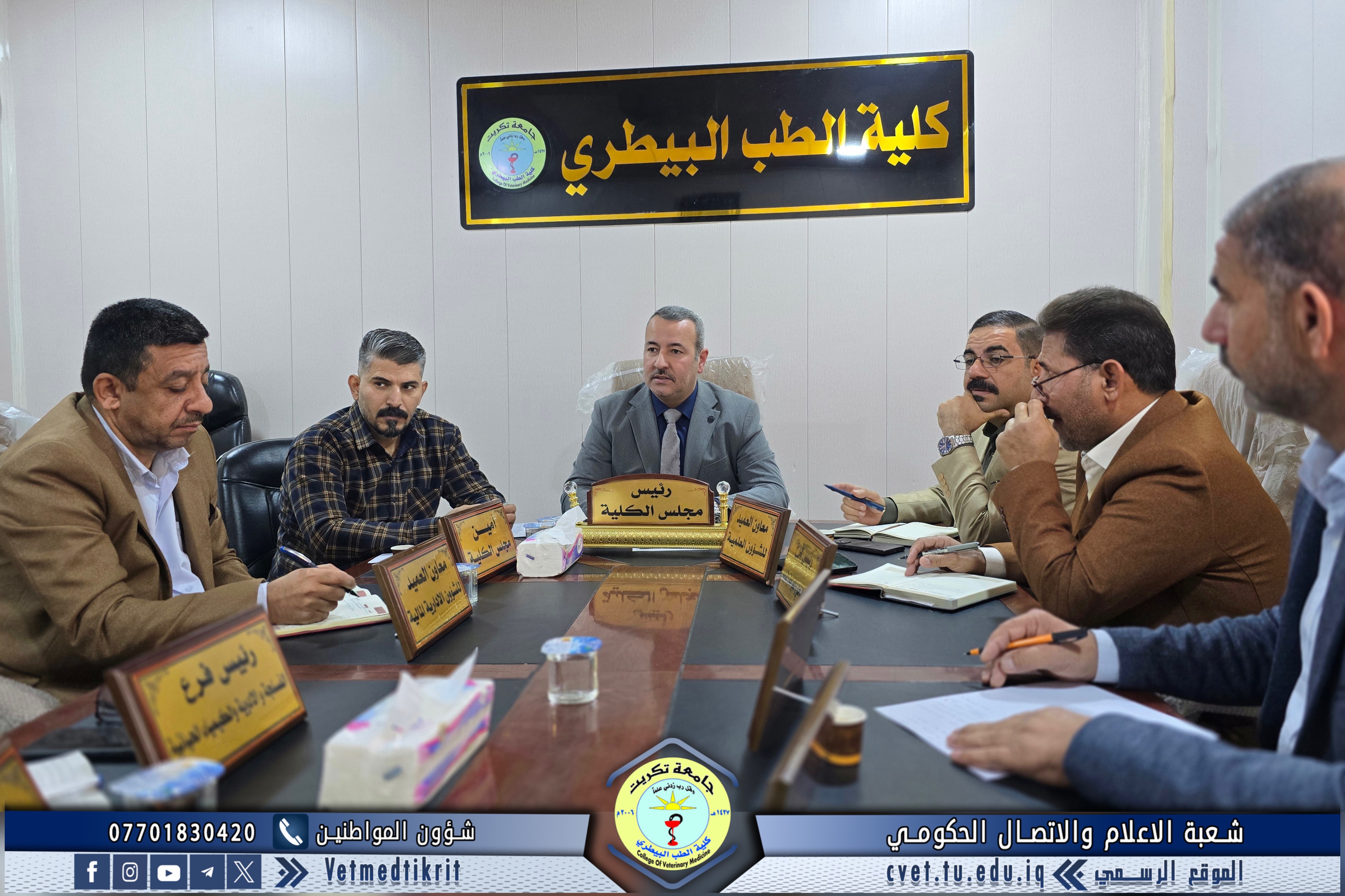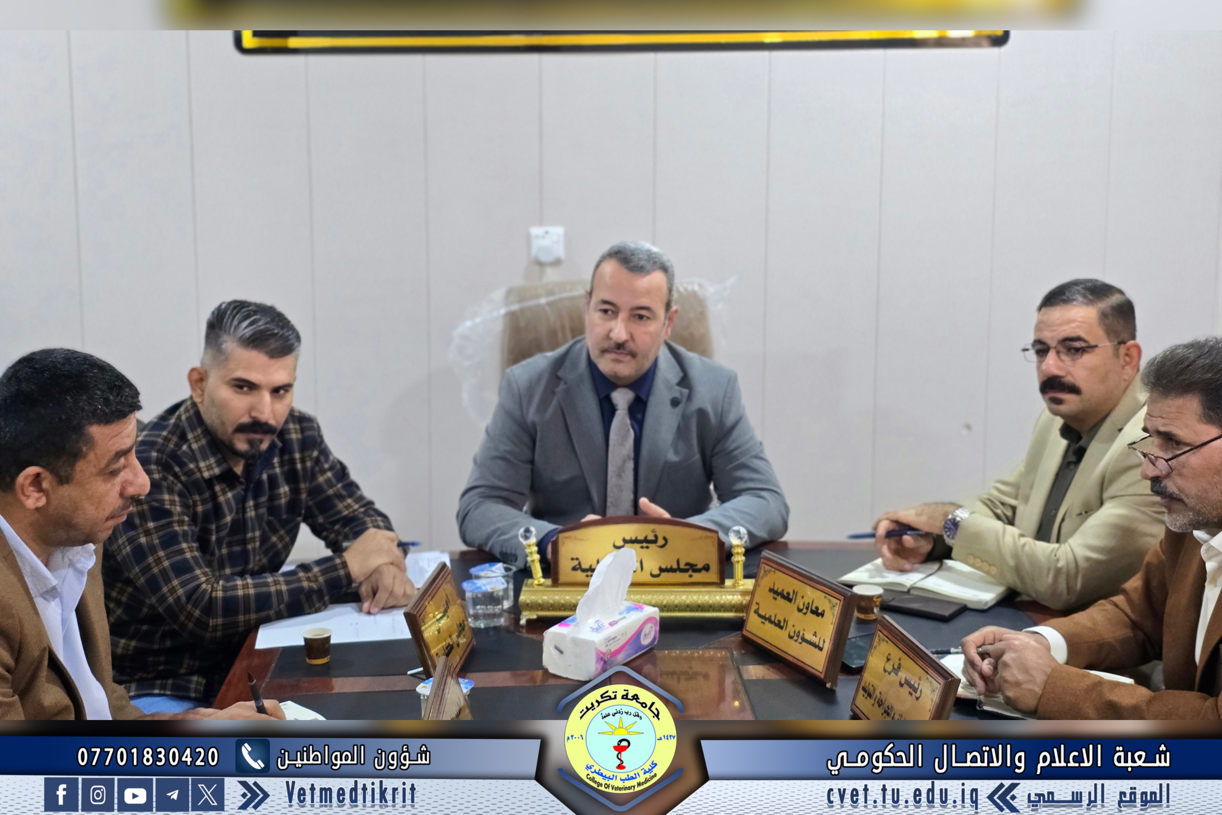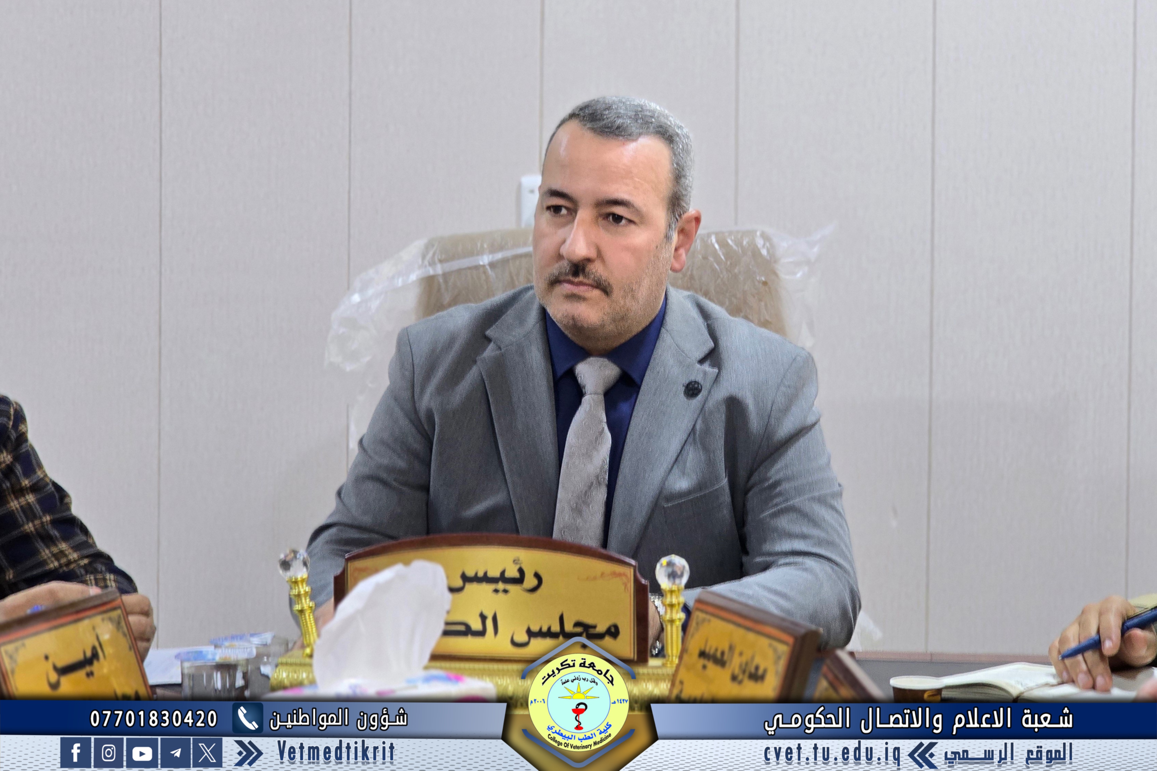 عقد مجلس كلية الطب البيطري في جامعة تكريت جلسته الخامسة للعام الدراسي 2025-2026 برئاسة الأستاذ الدكتور بشار صادق نومي عميد الكلية، وبحضور السادة المعاونين والسيدات والسادة رؤساء الفروع العلمية. في مستهل الاجتماع رحب السيد العميد بالحضور متمنياً لهم التوفيق والنجاح، ثم ناقش المجلس عدداً من القضايا المدرجة على جدول الأعمال، أبرزها تحديد موعد مناقشات عدد من طلبة الماجستير ،ومنح شهادة الماجستير لعدد من الطلبة، ومناقشة عناوين بحوث التخرج لطلبة المرحلة الخامسة مع تحديد اسماء المشرفين، وعدد من الامور الاخرى التي تهم الكلية بشكل عام. ويأتي انعقاد المجلس في إطار سعي الكلية لمواصلة مسيرتها العلمية والأكاديمية بخطوات مدروسة نحو التميز وضمان الجودة في الأداء التعليمي