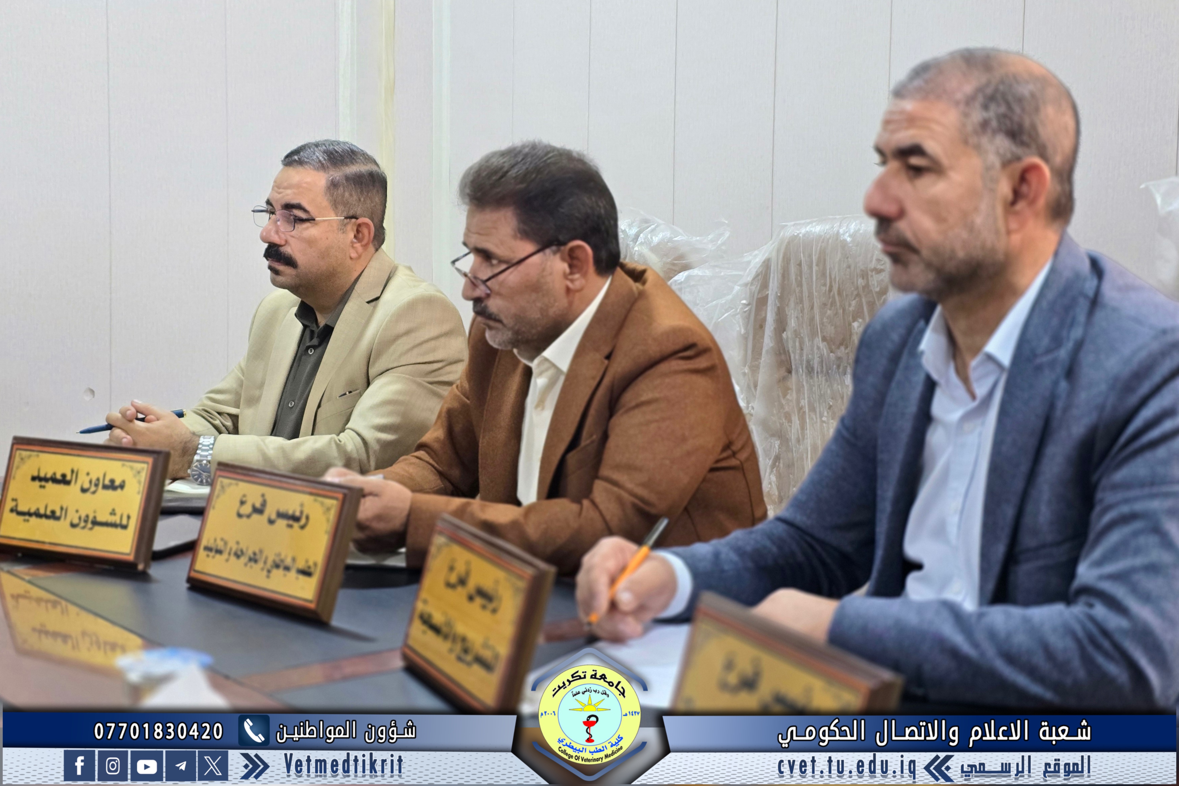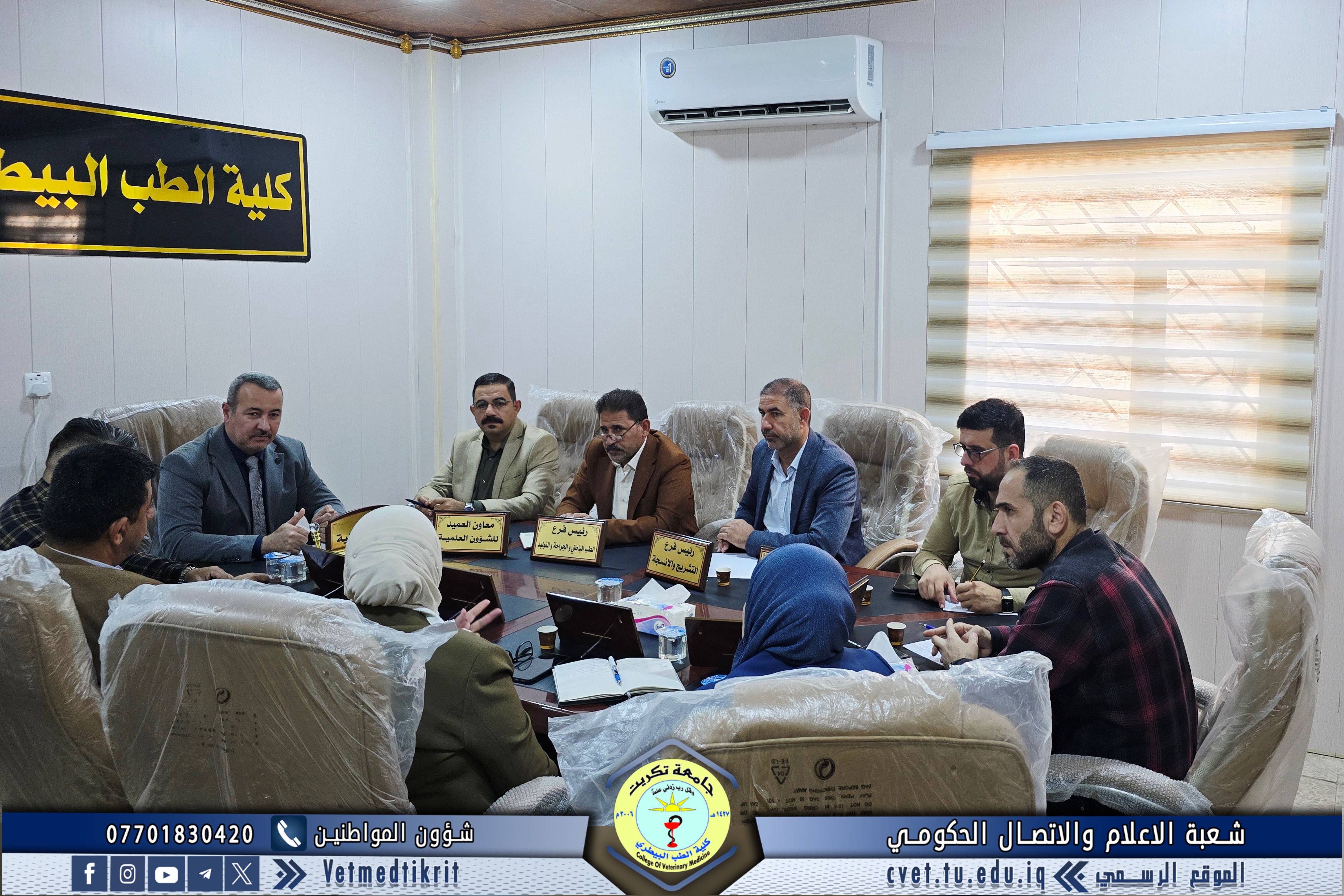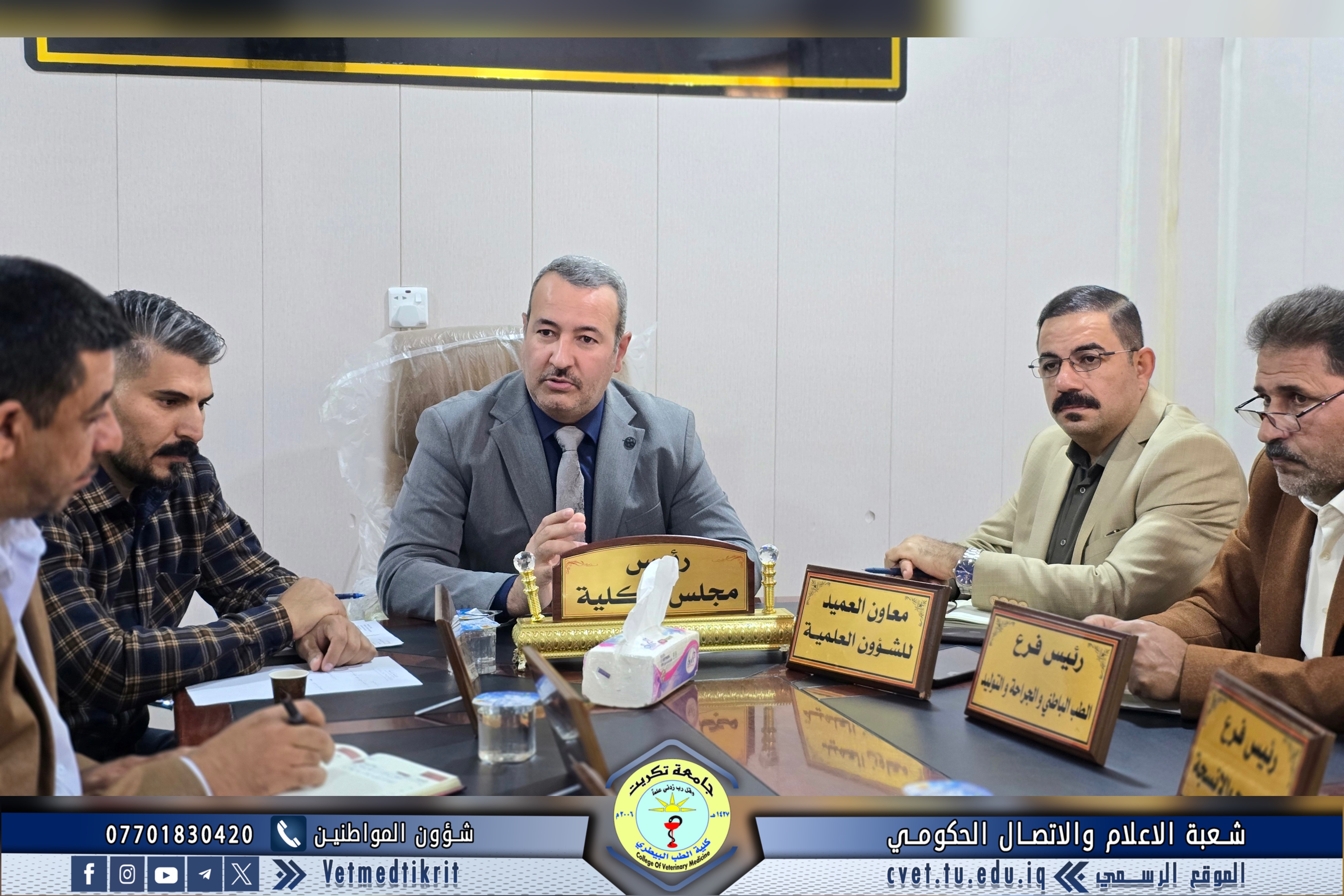 عقد مجلس كلية الطب البيطري في جامعة تكريت جلسته الخامسة للعام الدراسي 2025-2026 برئاسة الأستاذ الدكتور بشار صادق نومي عميد الكلية، وبحضور السادة المعاونين والسيدات والسادة رؤساء الفروع العلمية. في مستهل الاجتماع رحب السيد العميد بالحضور متمنياً لهم التوفيق والنجاح، ثم ناقش المجلس عدداً من القضايا المدرجة على جدول الأعمال، أبرزها تحديد موعد مناقشات عدد من طلبة الماجستير ،ومنح شهادة الماجستير لعدد من الطلبة، ومناقشة عناوين بحوث التخرج لطلبة المرحلة الخامسة مع تحديد اسماء المشرفين، وعدد من الامور الاخرى التي تهم الكلية بشكل عام. ويأتي انعقاد المجلس في إطار سعي الكلية لمواصلة مسيرتها العلمية والأكاديمية بخطوات مدروسة نحو التميز وضمان الجودة في الأداء التعليمي