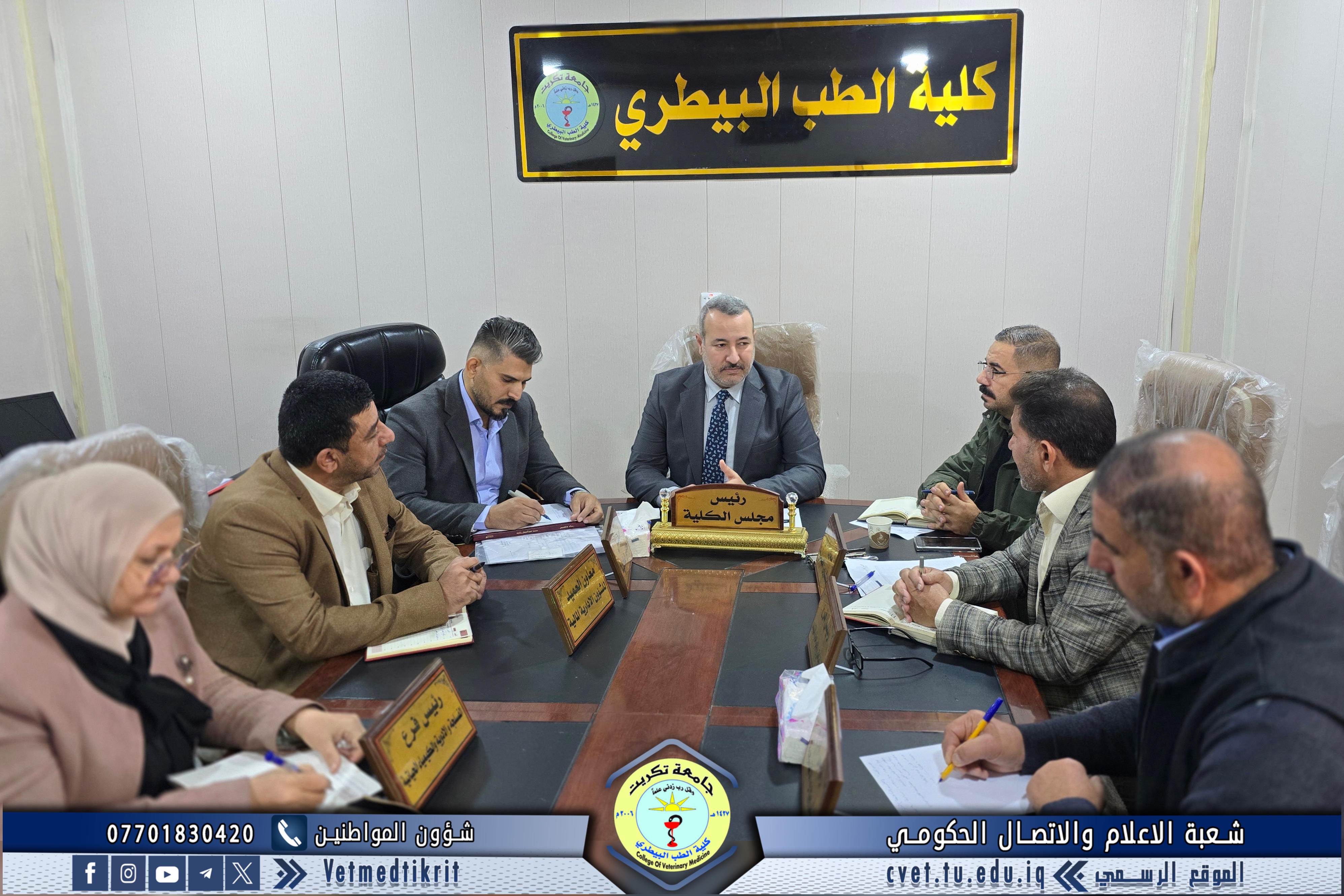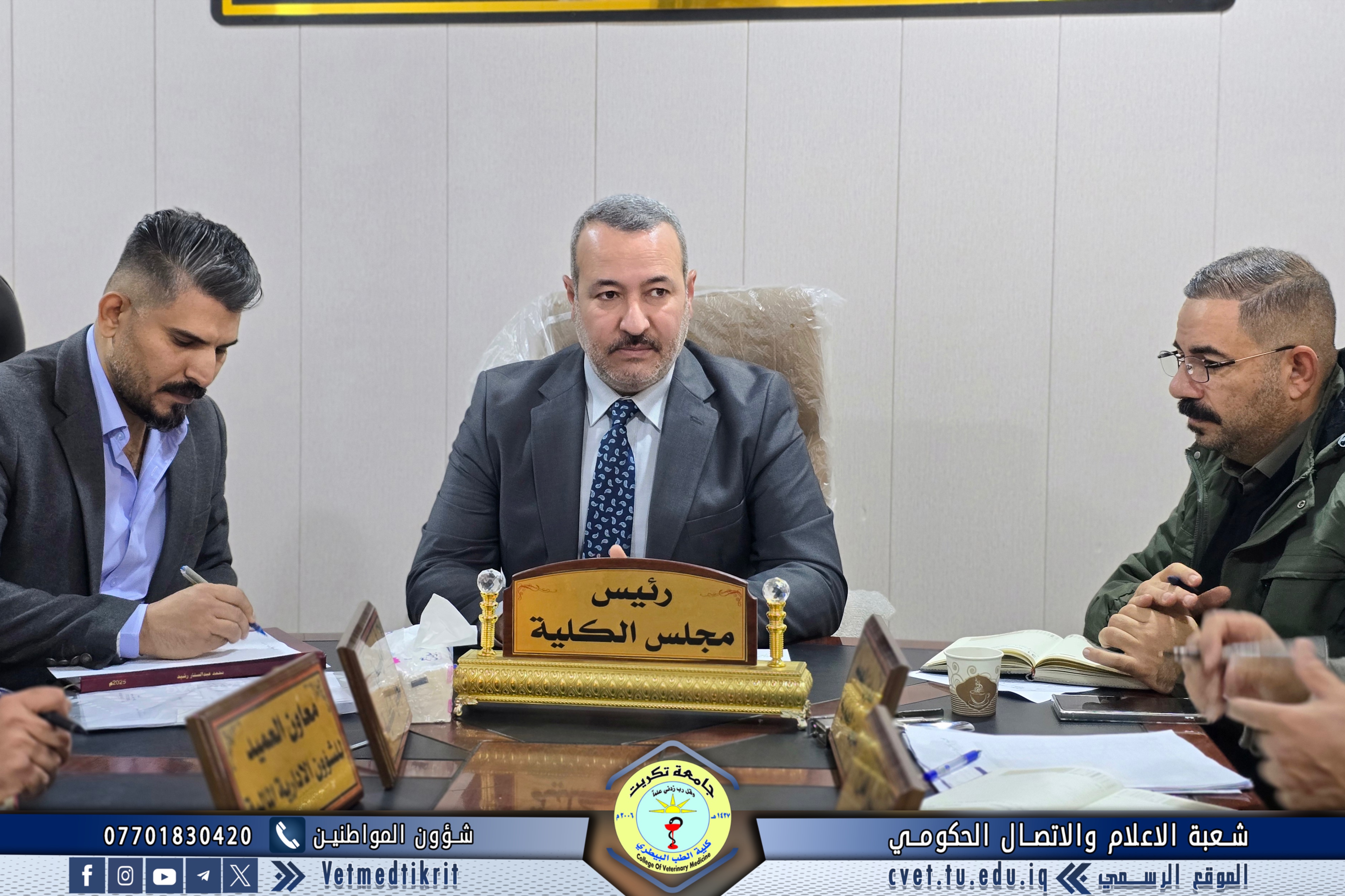 عقد مجلس كلية الطب البيطري في جامعة تكريت جلسته السابعة للعام الدراسي 2025–2026، برئاسة الأستاذ الدكتور بشار صادق نومي عميد الكلية، وبحضور السادة معاوني العميد، والسيدات والسادة رؤساء الفروع العلمية.