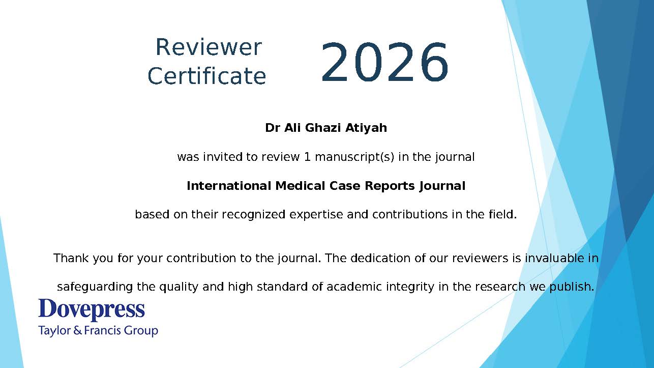 في إطار الانفتاح الأكاديمي وتعزيز الحضور العلمي الدولي، شارك الأستاذ المساعد الدكتور علي غازي عطية، التدريسي في كلية الطب البيطري بـ جامعة تكريت، في تقييم بحث علمي لصالح مجلة International Medical Case Reports الدولية المحكمة.