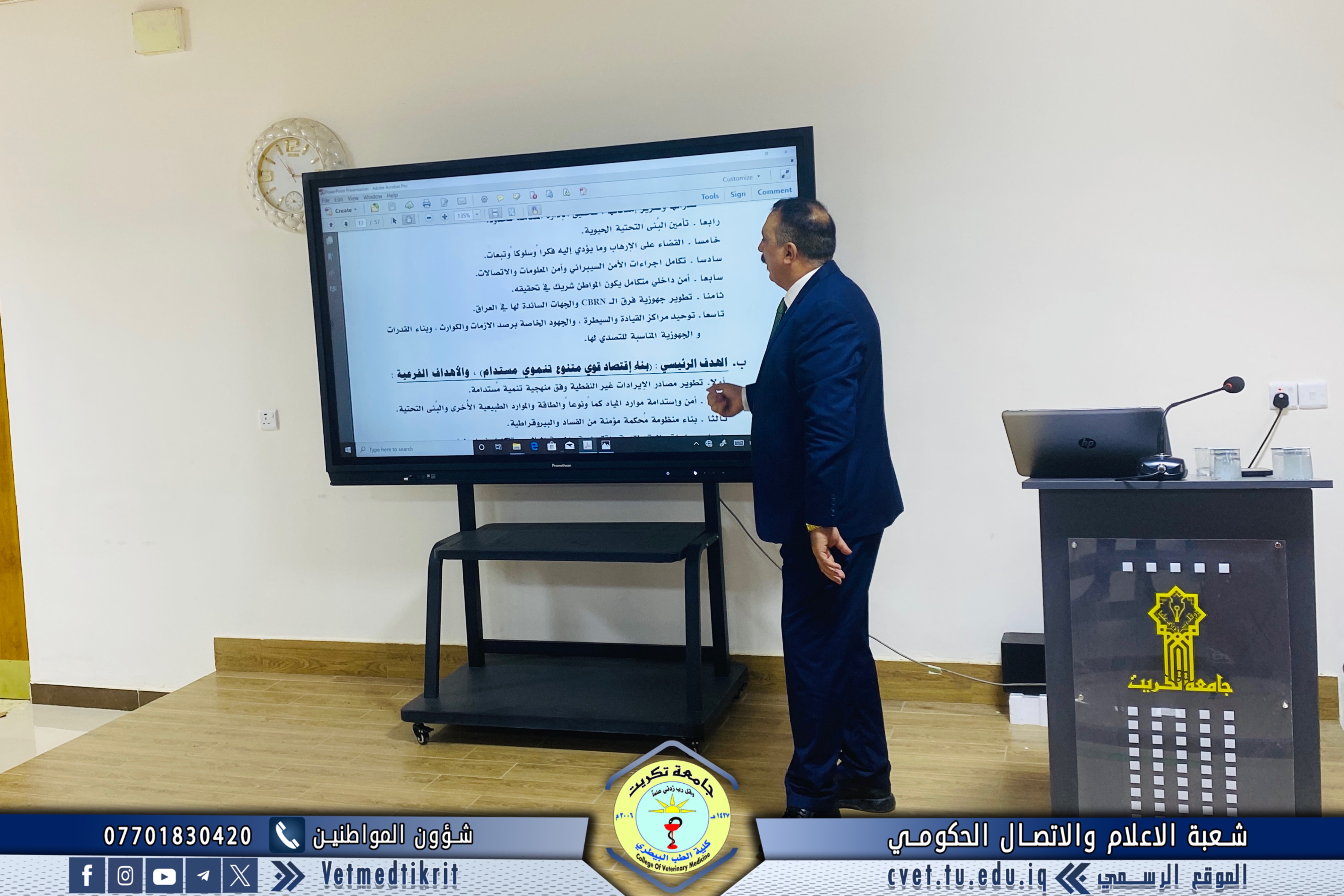 برعاية الأستاذ الدكتور وعد محمود رؤوف رئيس جامعة تكريت، وضمن سلسلة نشاطاتها العلمية والثقافية، نظمت كلية الطب البيطري بجامعة تكريت ندوة علمية مهمة بعنوان (متابعة وتفعيل استراتيجية الأمن الوطني – العراق أولاً)، بحضور الأستاذ الدكتور بشار صادق نومي عميد كلية الطب البيطري، والأستاذ المساعد الدكتور محمد رحيل علي عميد كلية طب الأسنان، وعدد من التدريسيين والموظفين. قدم الندوة الأستاذ الدكتور ظافر مدحي فيصل من كلية القانون، حيث استعرض مجموعة من المحاور الجوهرية التي تشكل الركائز الأساسية للأمن الوطني، من أبرزها: